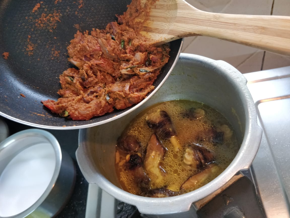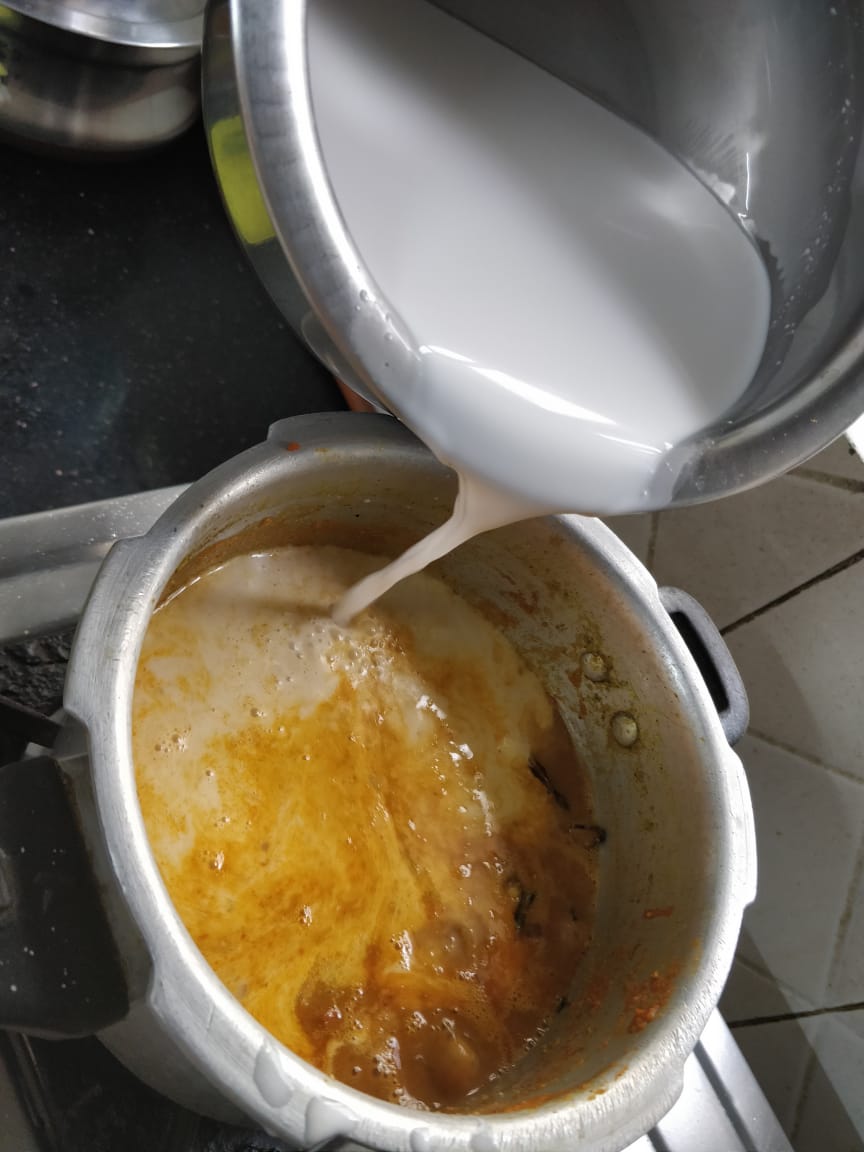 Add the pan mixture to pressure cooker, then the coconut milk, salt and close it.