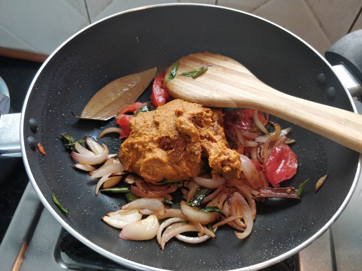 In a pan heat oil, saute cinnamon, bay leaf, cloves and big onion stir well add the tomatoes and let it cook well.