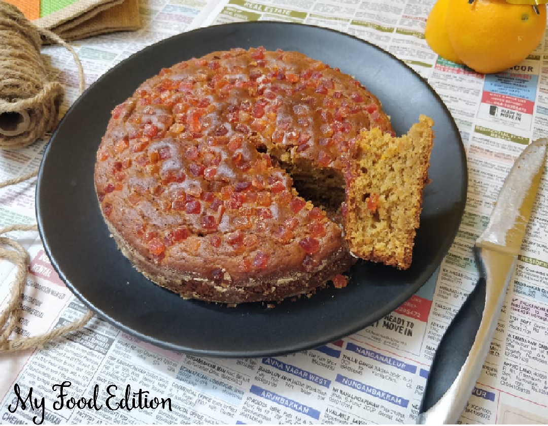 Baking is an art! It gives me great satisfaction! When I started baking, I wanted to avoid refined maida, sugar, colours and chemicals. At first, I was sceptical but now using brown ingredients like wheat, jaggery , dates, and millets give me great happiness when my family loves it. I generally prefer baking with fresh fruits and vegetables available in my refrigerator compartment. Oranges are full of vitamin-c which are the best addition to this cake. This cake is loaded with nutrients and very good for kids evening snack. The colour of orange makes the cake more attractive. I admire cakes a lot. So, I don’t feel like cutting them. But then I did sliced into it and fell in love even more. Do try this cake and enjoy the cake with your family. Lets get started with the making of orange cake. Happy baking!