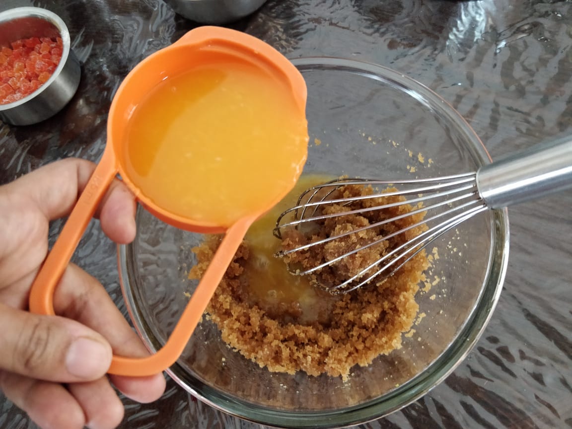 In a large mixing bowl, add oil and sugar mix well using a whisk.