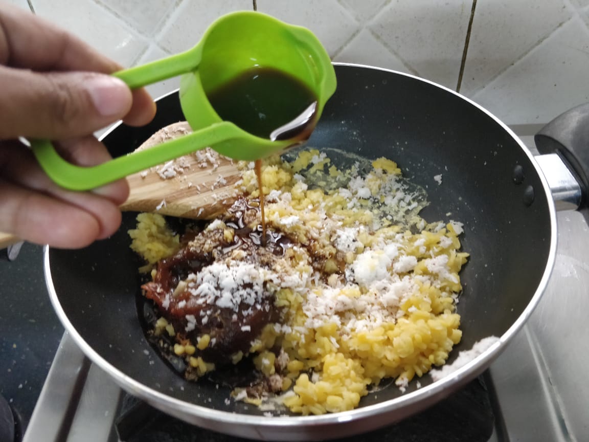 Heat the pan add the cooked moong dhal,sesame powder,jaggery syrup,cardamom powder and grated coconut.