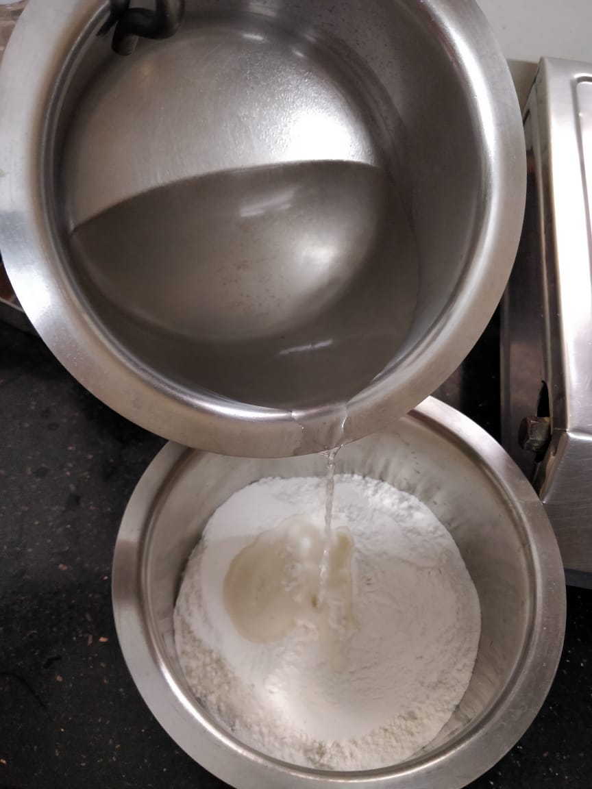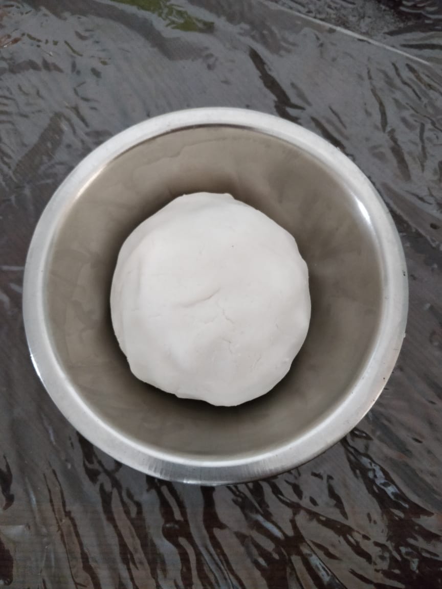 Add the boiling water to roasted rice flour little by little to make a smooth dough.