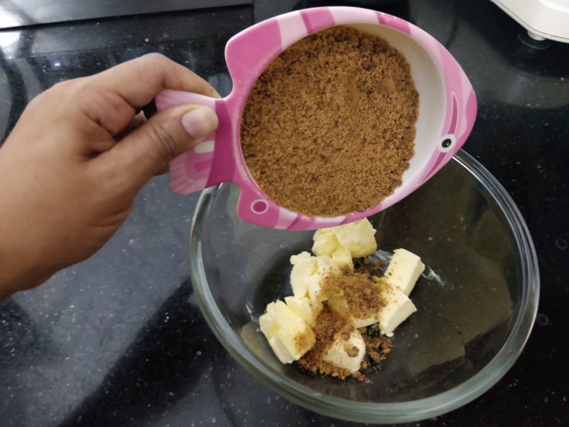 In a bowl add butter and jaggery powder ( pulse jaggery to make it powder in mixer jar).
