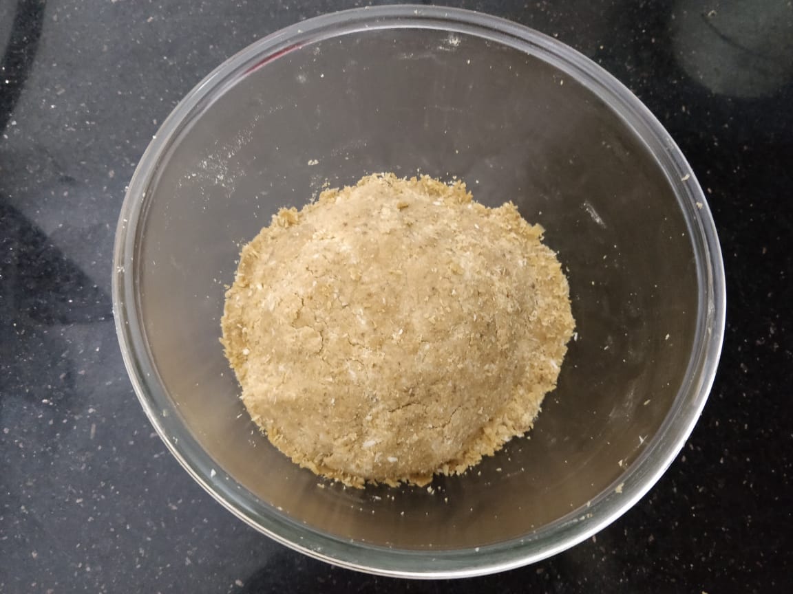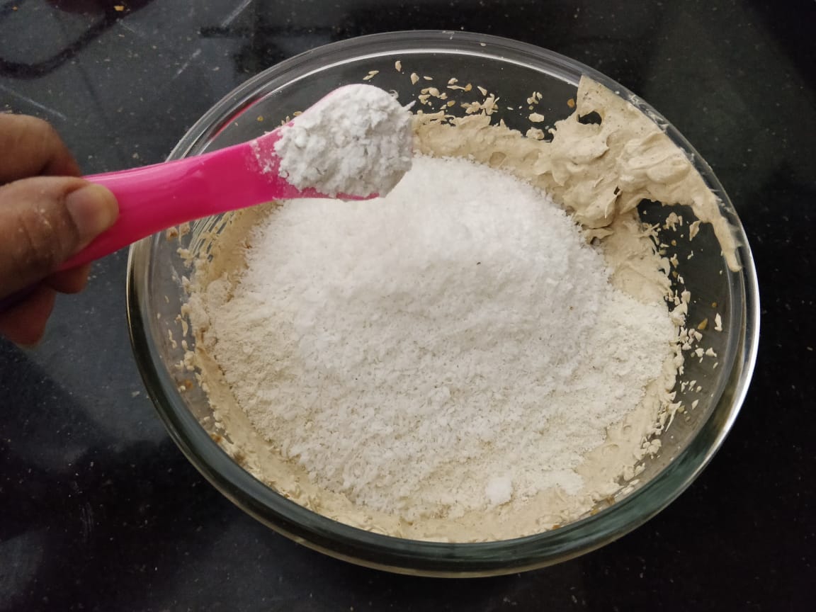 Add in the wheat flour , powdered oats, milk powder , desicated coconut and cardamom powder.