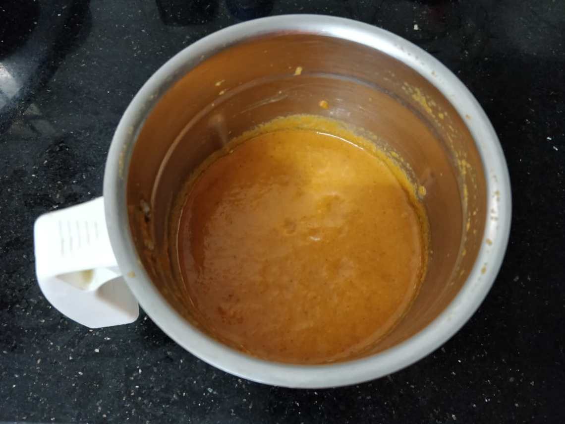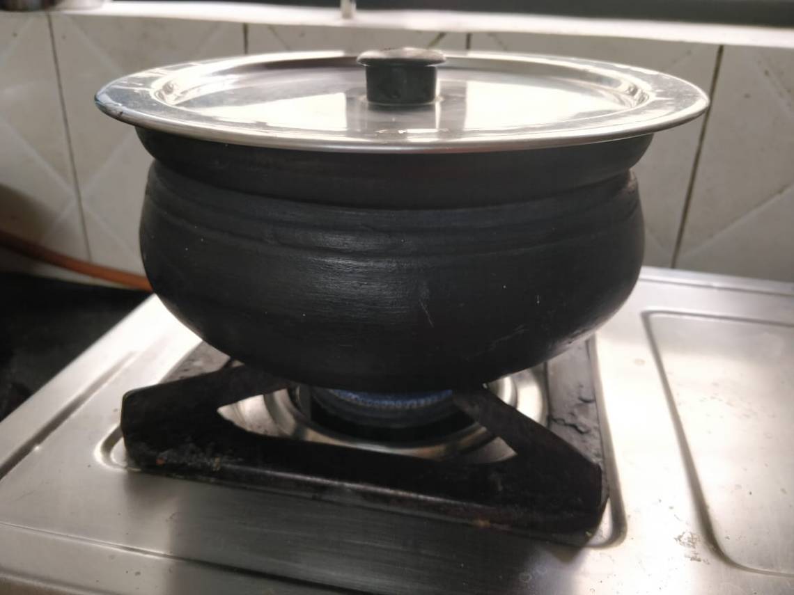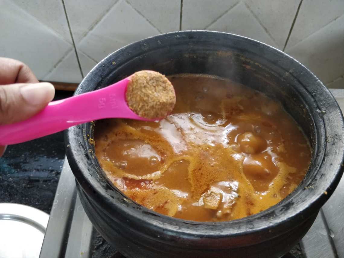 Heat coconut oil in earthen pot , add the ground masala and stir well until raw smell goes.