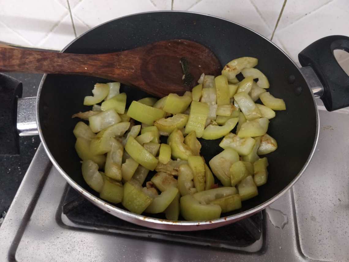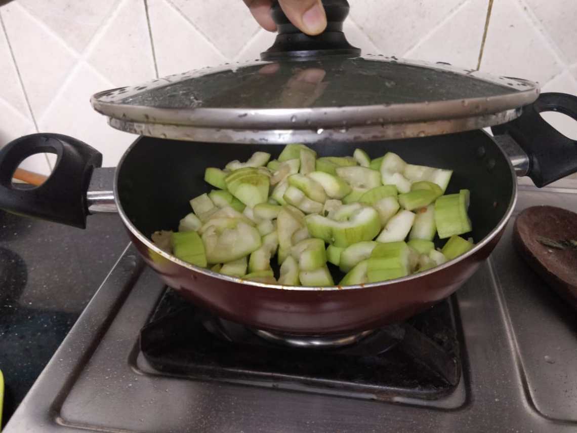 In the same wok add the chopped bottle gourd and close the lid and allow it to cook.