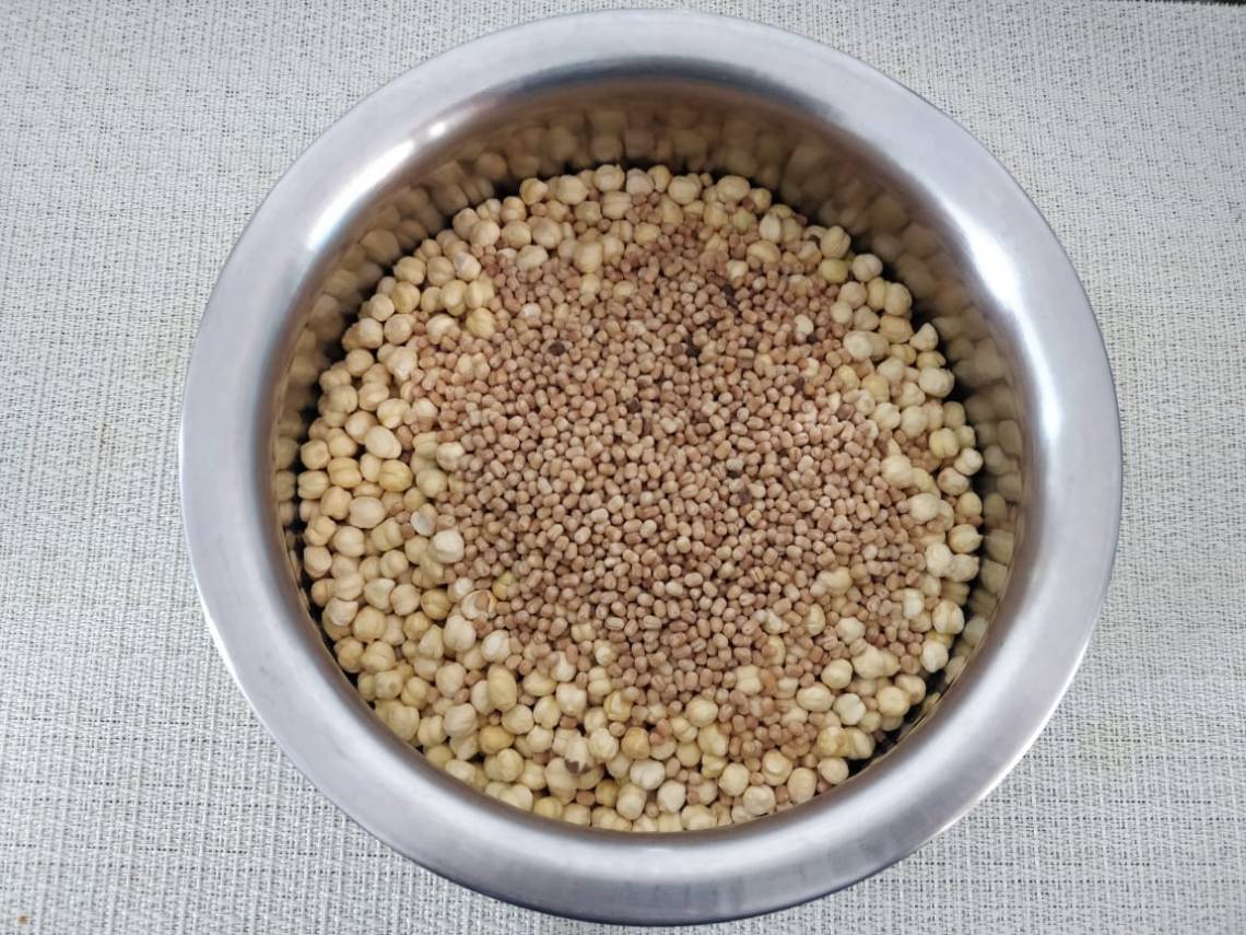 Dry roast urud dhal till golden colour and blend it with fried gram to a fine powder.