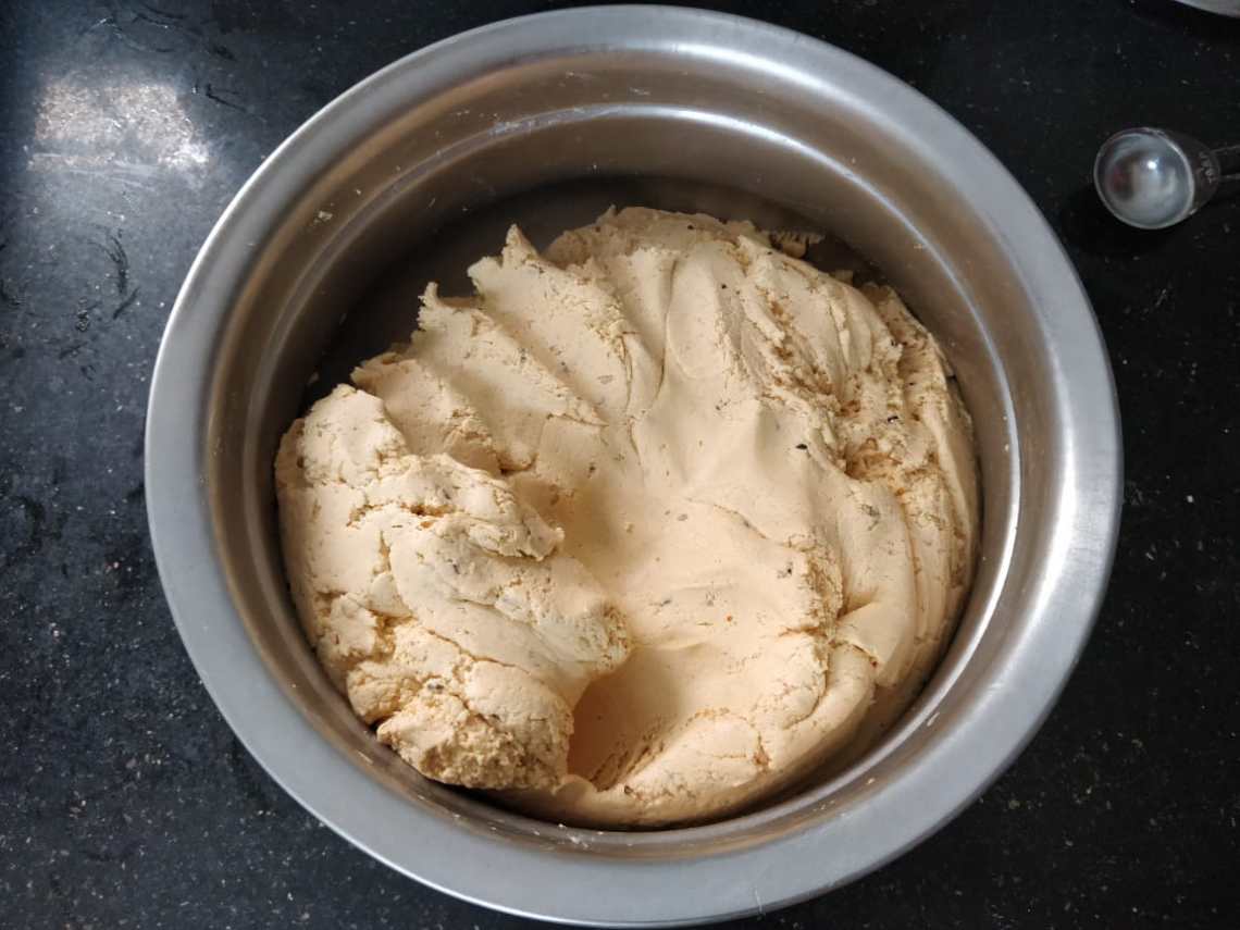 Transfer the batter to a bowl and add the sifted flour, sesame seeds, cumin seeds, butter and water to make a thick dough.