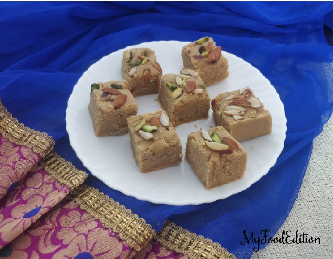 Sweets are a must during festive time. Diwali is all about crackers, sweets and muruku ( chakli). We prepare our traditional sweets and savoury for diwali and distribute them to our relatives and friends . Sweets are made with home made ghee so it smells heavenly and tempt us to have them more while preparing it . Sweets taste delicious when had hot from pan. I love tasting sweets when hot. Seven cups burfi is made using gram flour , coconut , sugar, ghee and milk. You don’t have to run to mil to ground flour. Readily available gram flour can be used to make this burfi. This is everybodies favourite sweet in our home. I usually make this burfi with brown sugar. It just melts in mouth . Do try it and enjoy it with your family and friends!