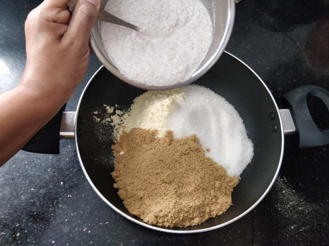 In a nobstick pan, add gram flour, sugars and ground coconut paste.