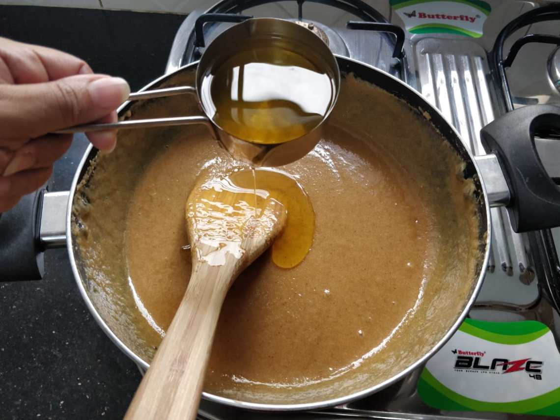 Once ghee is absorbed add ghee little by little and keep stirring.
