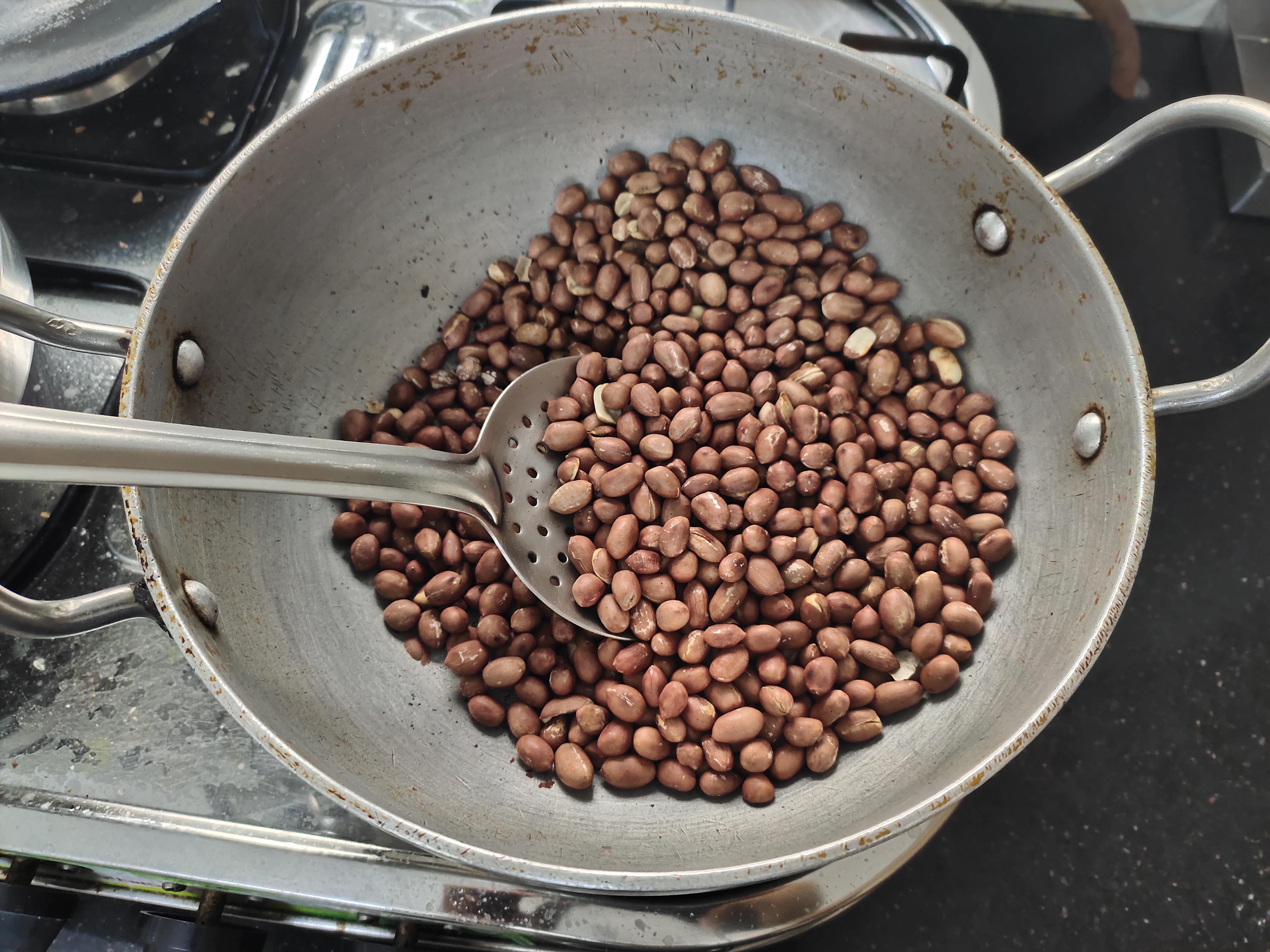 Dry roast the peanuts until the colour changes and skin starts to peel.