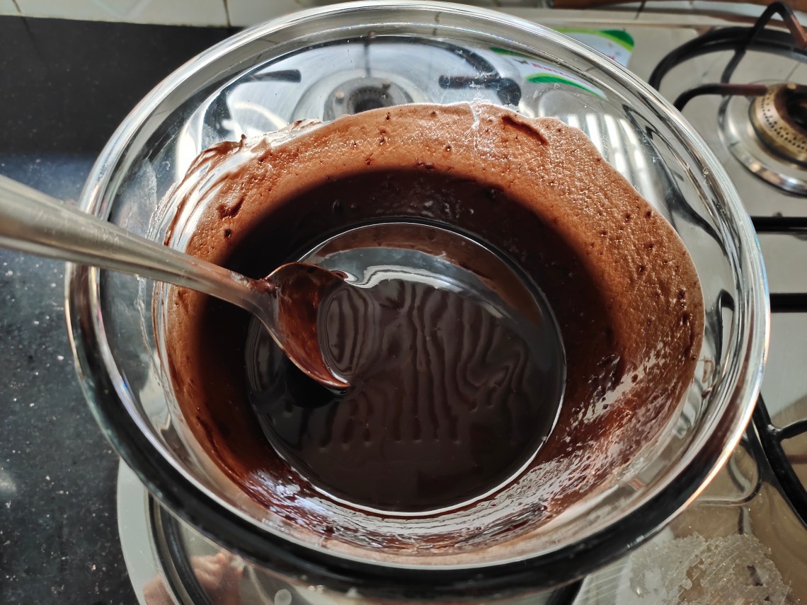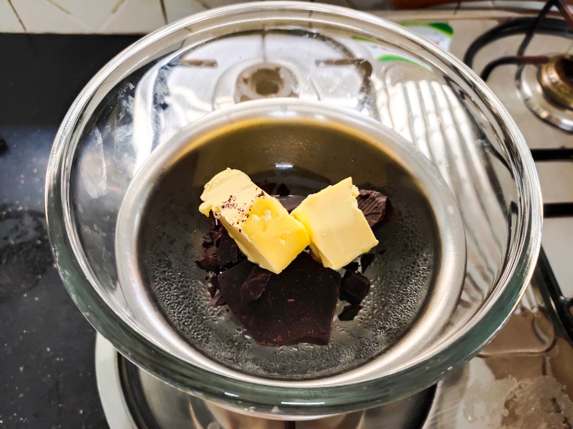 Melt butter and dark chocolate ( 70gm) by double boiling method.
