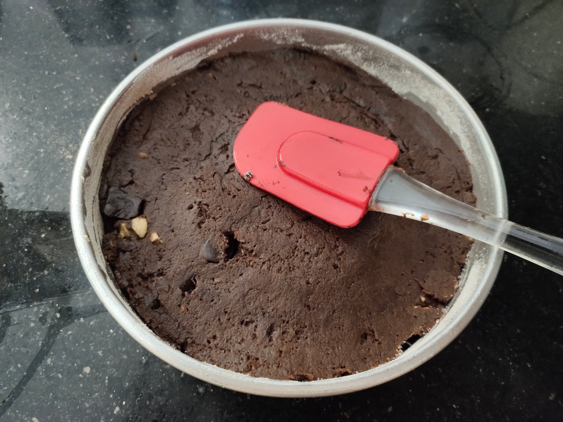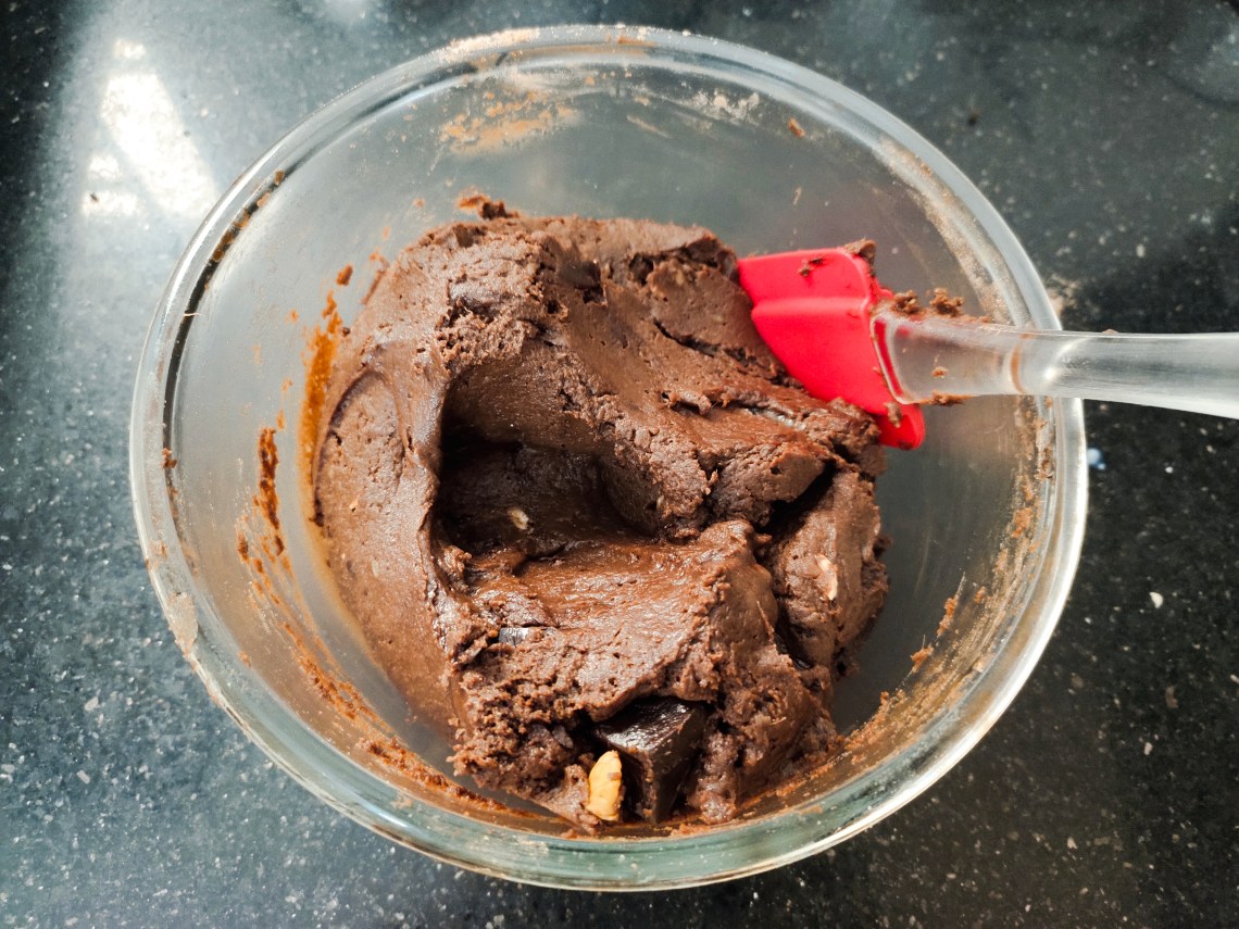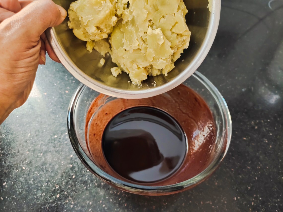 Add the smashed sweet potato to the melted butter chocolate mixture.
