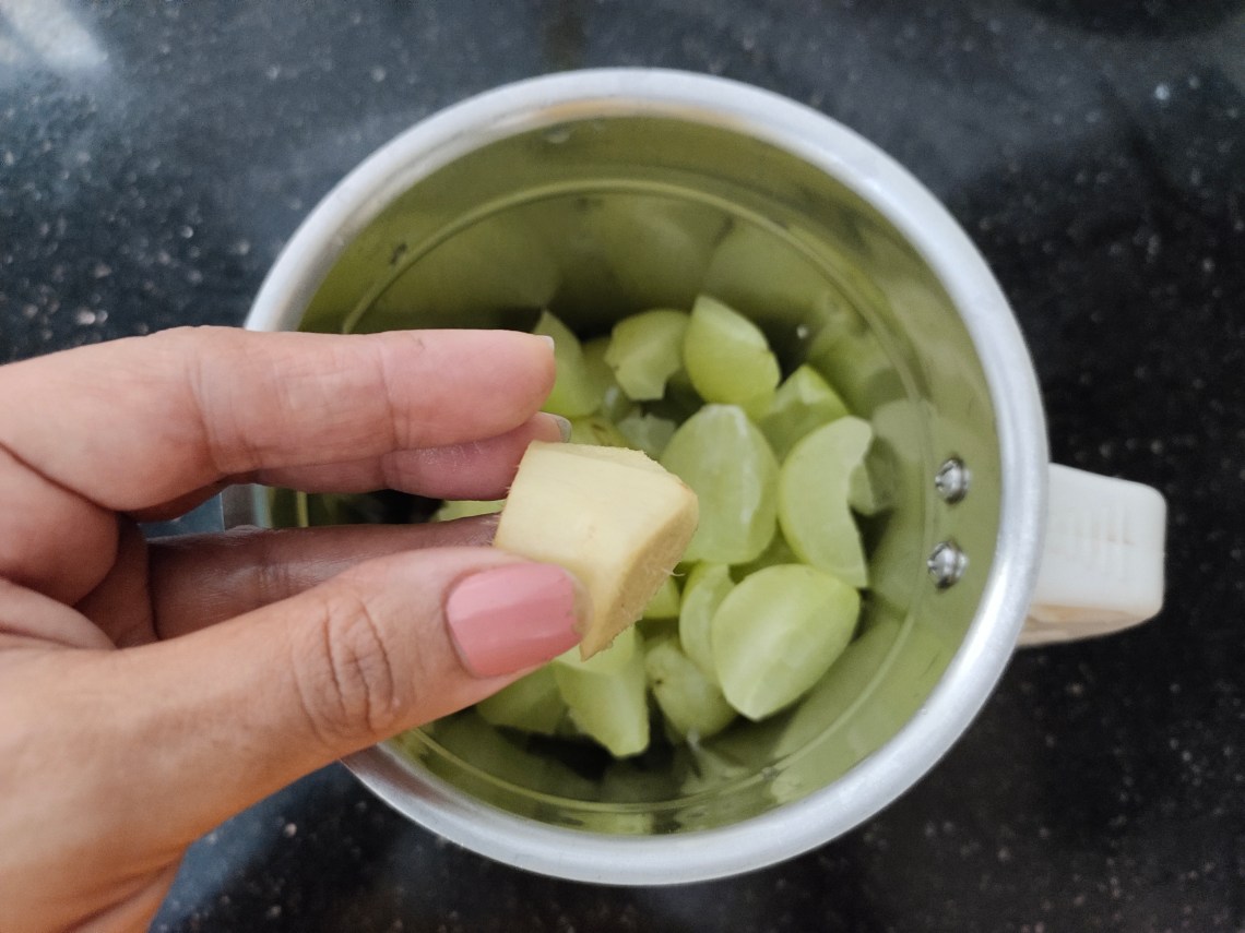 In a mixer jar add chopped amla, ginger and blend.