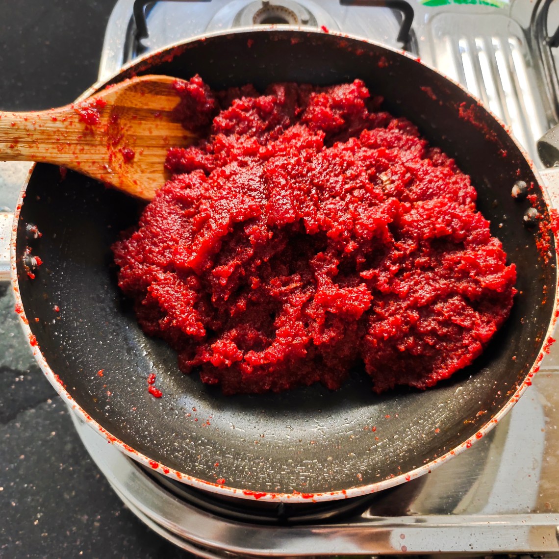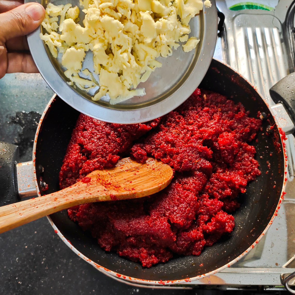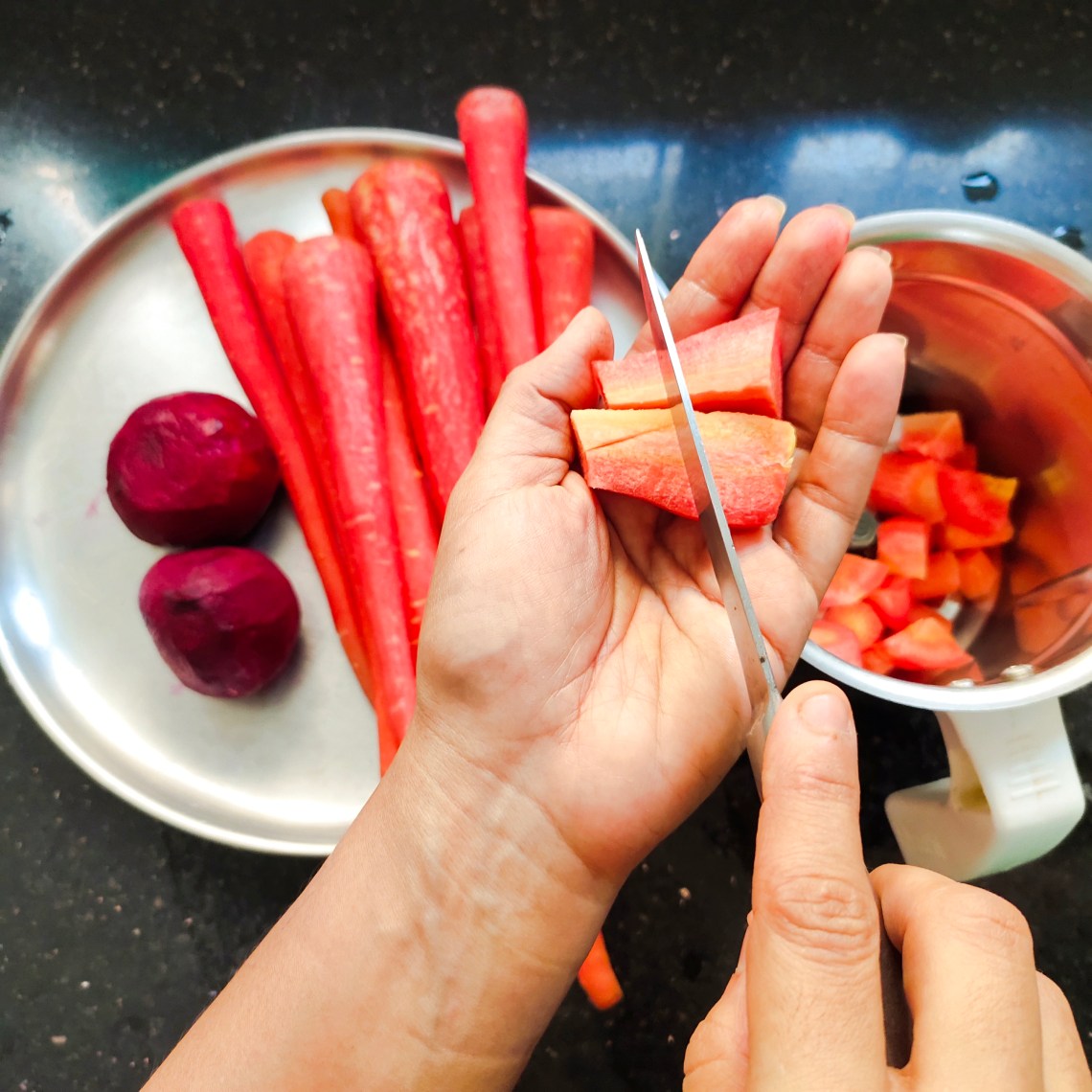 Carrot halwa is a mouth watering indian dessert which is loved by all age groups. While in grocery shopping, long red carrots attracted me and it striked me to make this halwa. Cutting veggies is an art ! When it comes to cooking, I like to chop and do everything on my own. Suddenly thought of giving a twist to the halwa by adding beets. It came out so delicious and colourful. The halwa resulted in an attractive dark red colour which is my favourite colour. With a dash of saffron and fried nuts halwa is outstanding. Every bite is flavourful and just melts in mouth. Its a big hit at my home. Tips for making quick halwa is given in notes so do read and try this healthy delicious and rich halwa for your loved ones and enjoy it !
