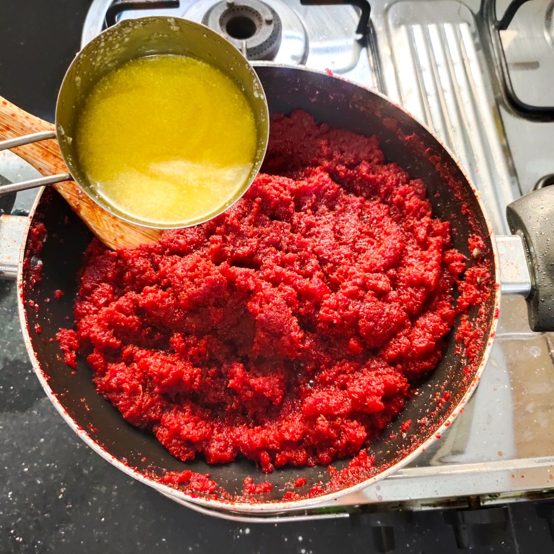 [Keep aside 2 tbsp ghee to fry nuts at the end.]
