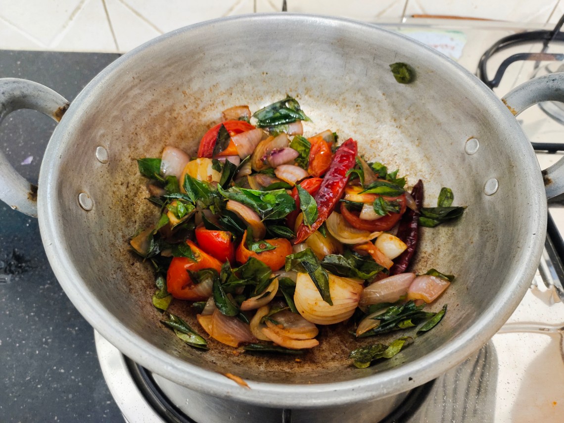 In same wok saute onions, tomatoes, red chilli, curry leaves and asafoetida.