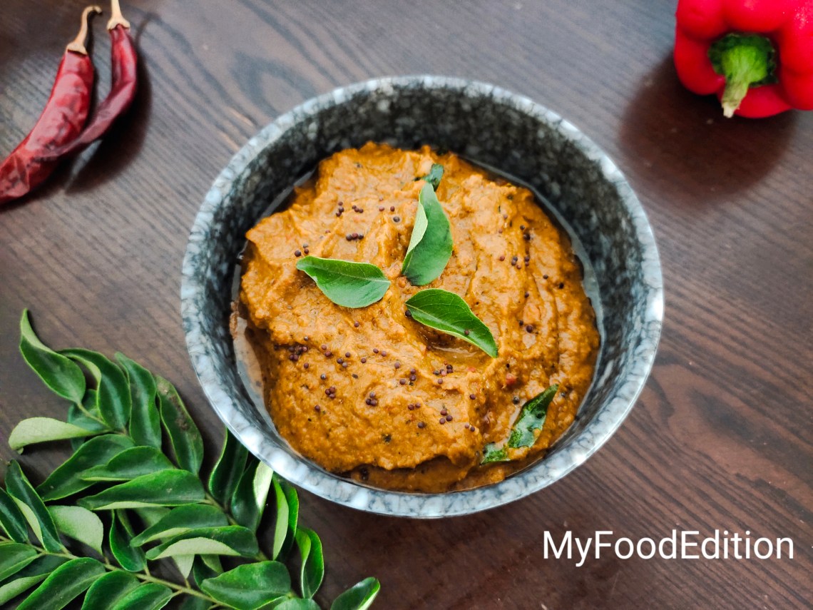 South Indian’s regular gluten free breakfast is the most popular idli / dosa and the sidedish would be sambar, coconut chutney, coriander chutney, mint chutney, peanut chutney, tomato chutney, onion chutney or spicy Kara chutney. Red capsicum is little different from other chutneys. Capsicum gives colour, flavour and different taste to this chutney. Curry leaves are rich in iron so I try to blend it wherever possible to give my kids have it. I had a small capsicum so tried this chutney and it came out really tasty and my family liked it. Do try it for your family and enjoy it with idli or dosa.