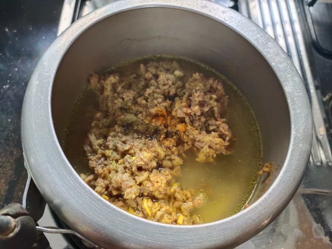 Pressure cook minced mutton with water and salt ( 1/2tsp) for 5 whistles.