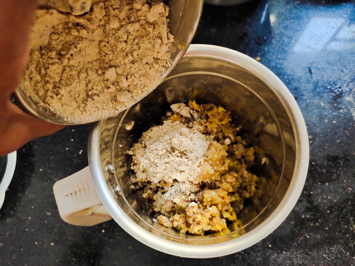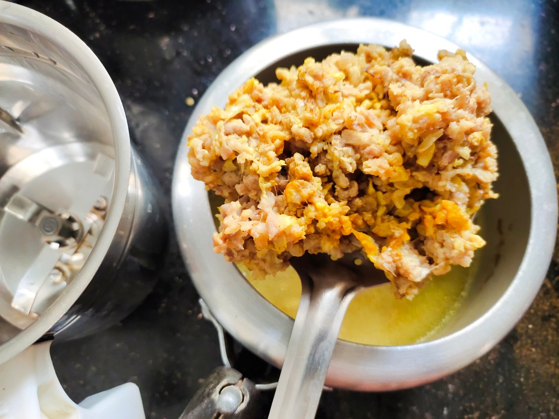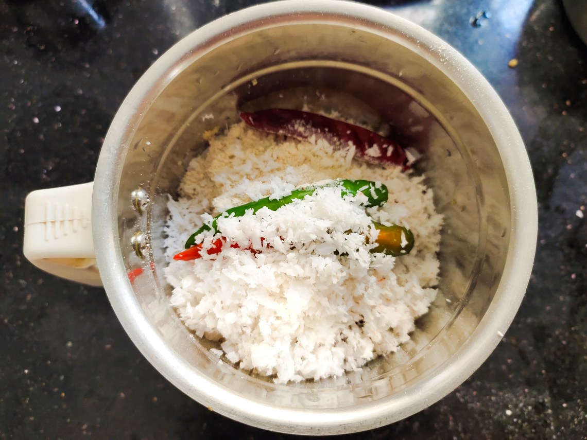 Add the powdered bengal gram flour mixture, coconut scrapping, chillies, salt and blend it to a fine paste.