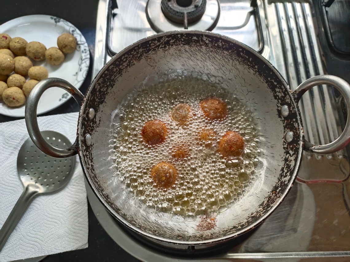 Heat oil in a pan and fry 5 to 6 balls at a time in medium flame.