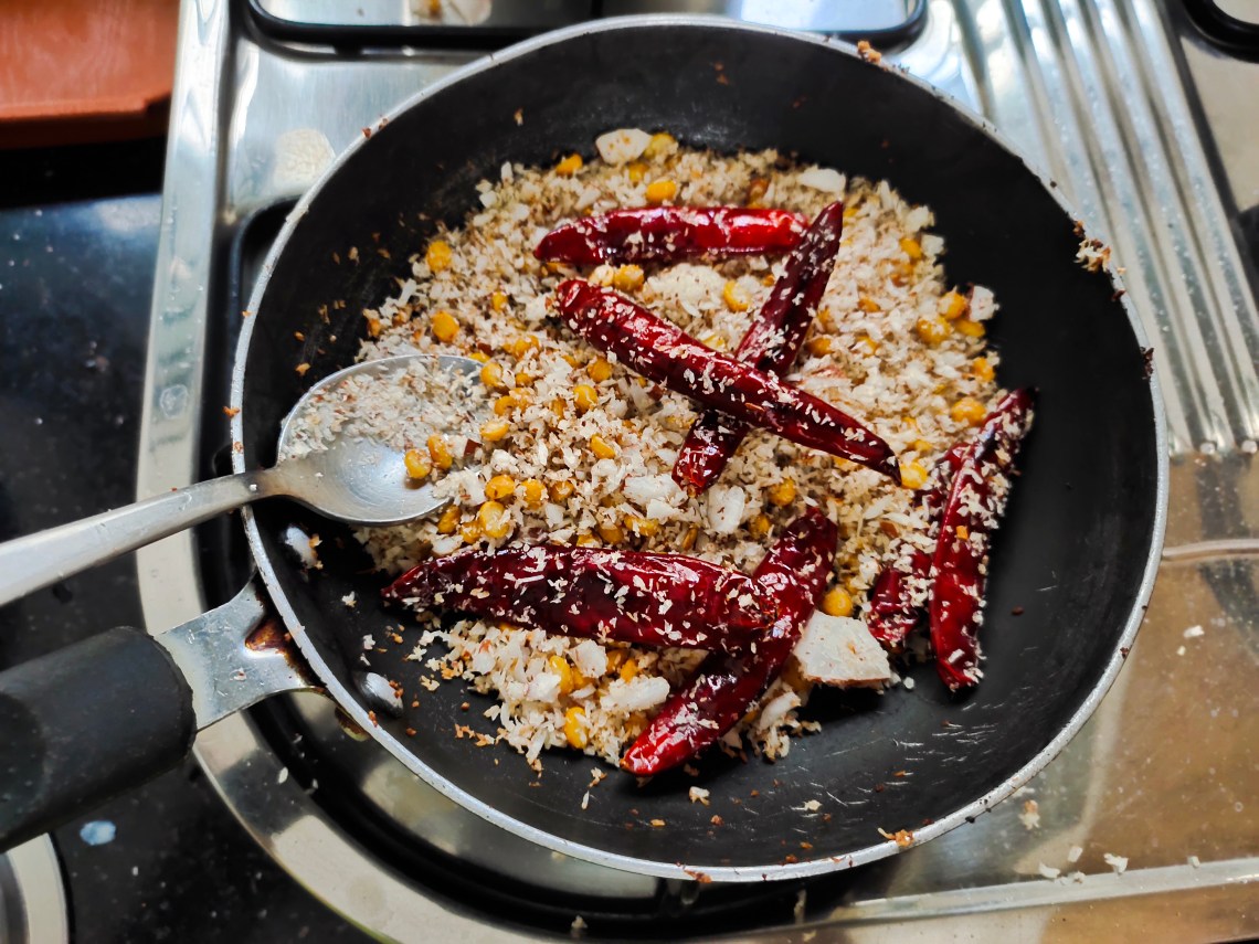 In a wok heat coconut oil and roast the items given above for roasting till golden.