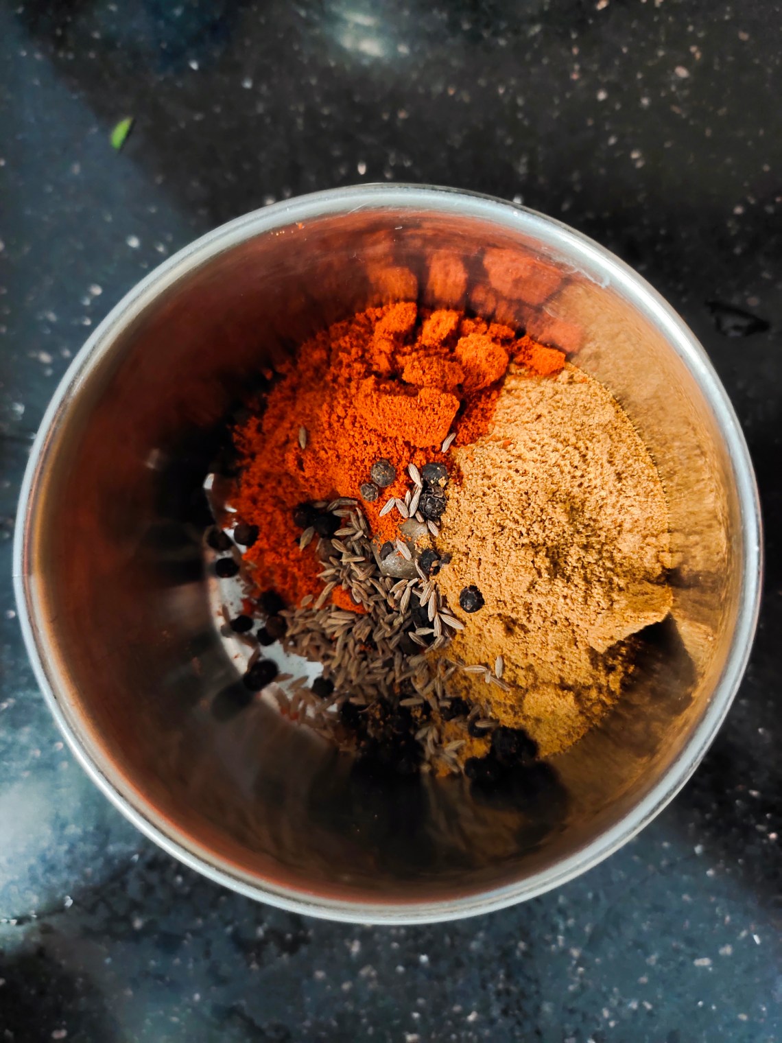 In a small mixer jar blend cumin, pepper, Chilli powder, and coriander powder to a fine powder.