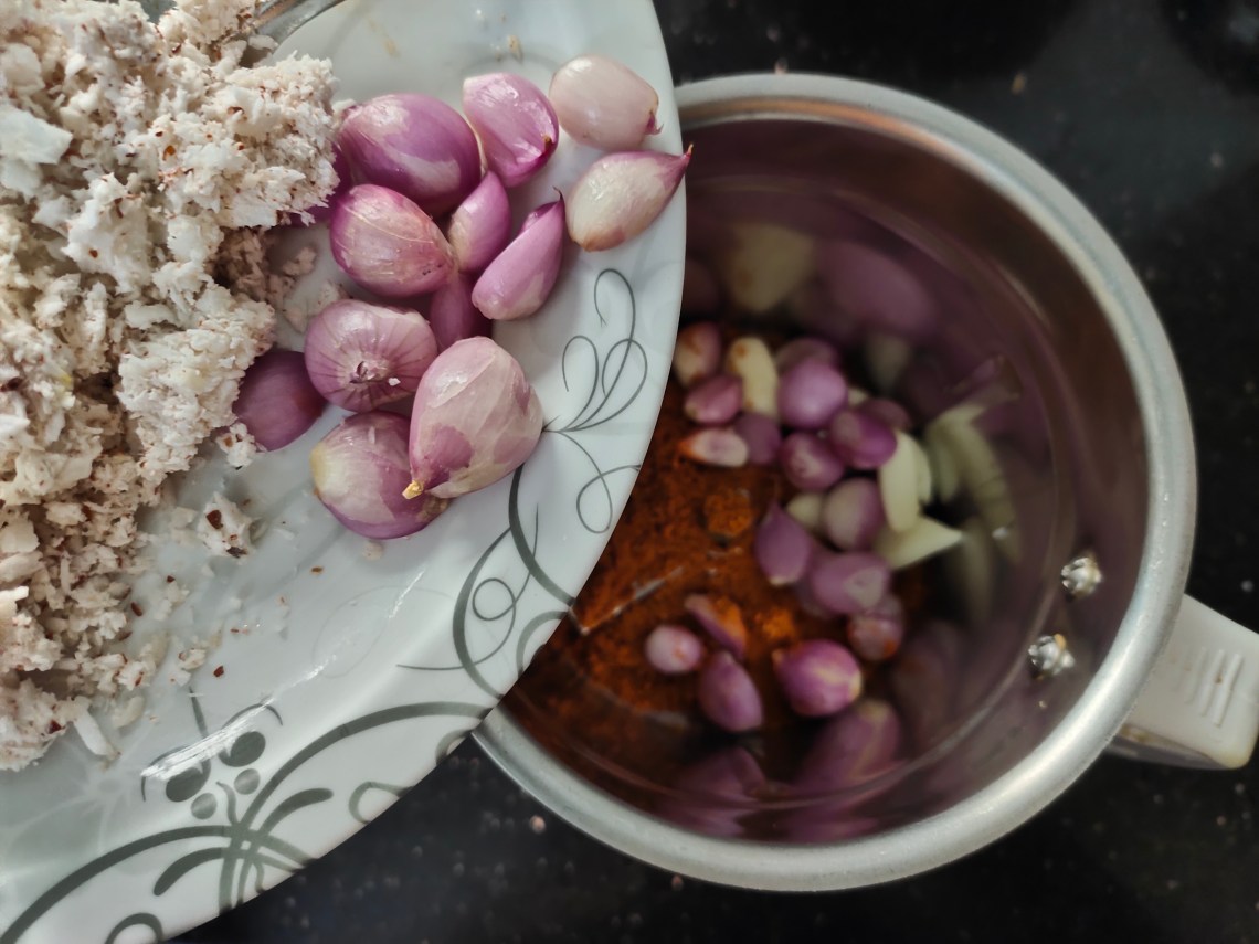 In a big mixer jar add the ground powder, coconut, shallots and garlic.