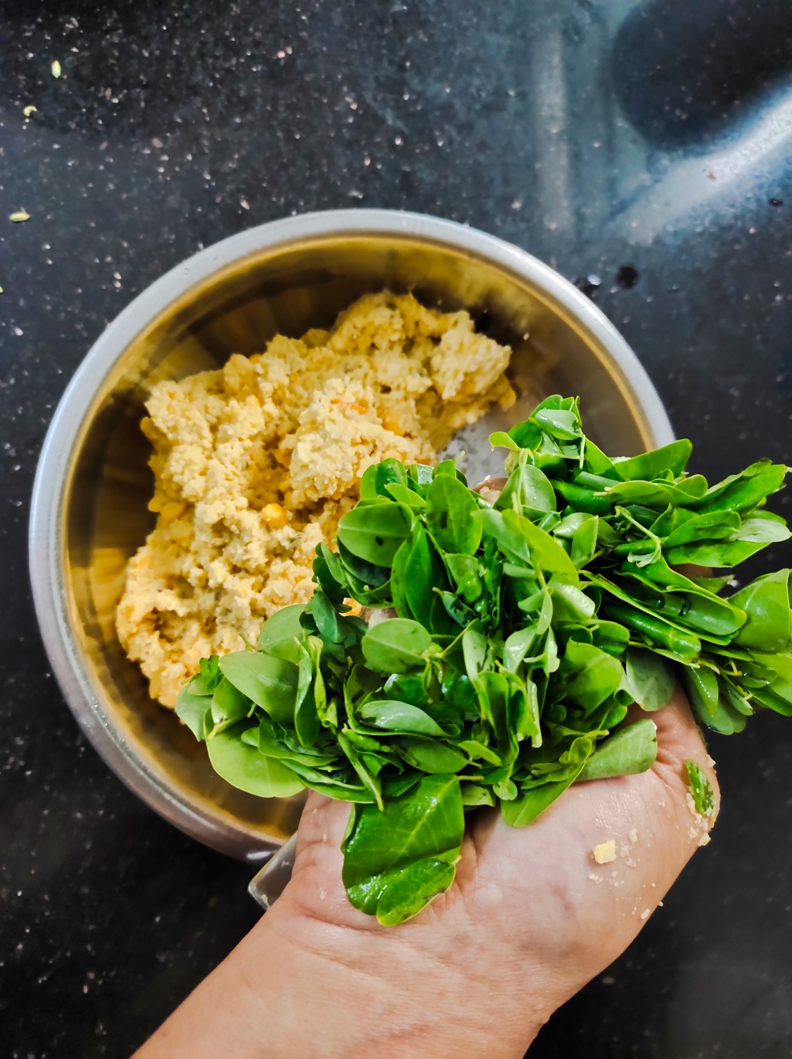 To the ground mixture add the washed, drained moringa leaves and mix well.