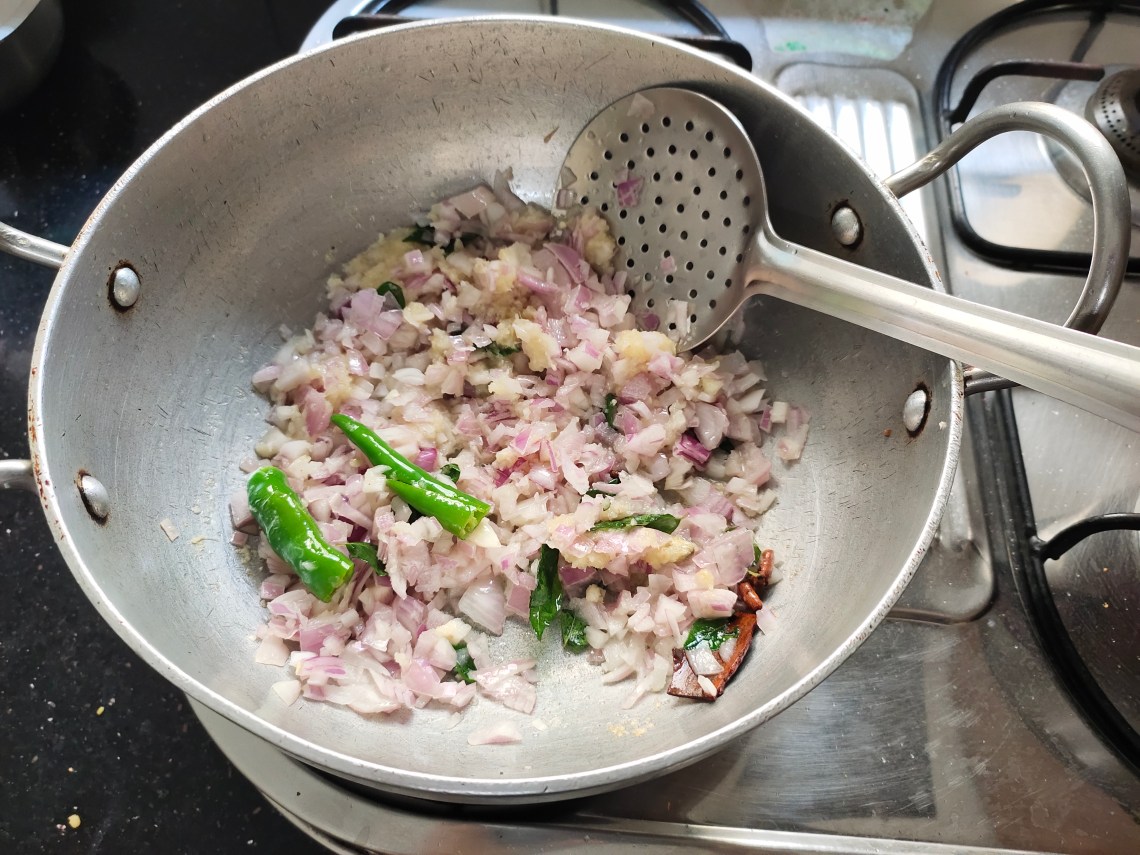 Saute green chilli, ginger garlic paste and finely chopped onions.