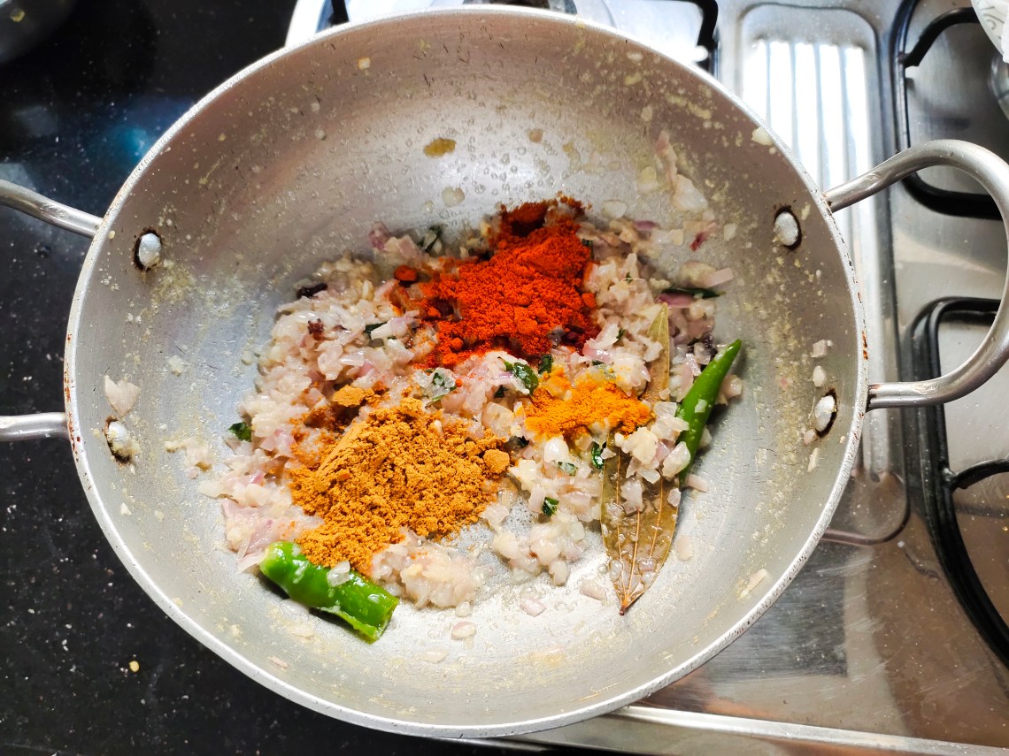 Add the red chilli powder, coriander powder, turmeric powder and mix well untill raw smell goes off.