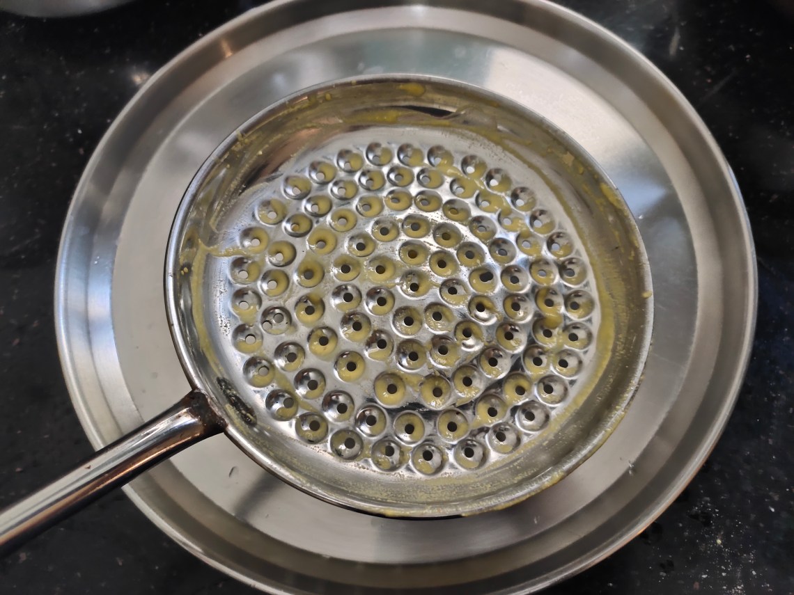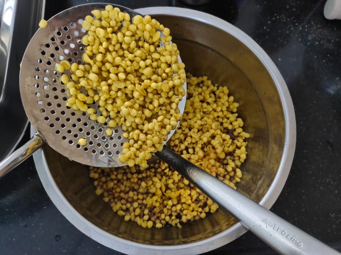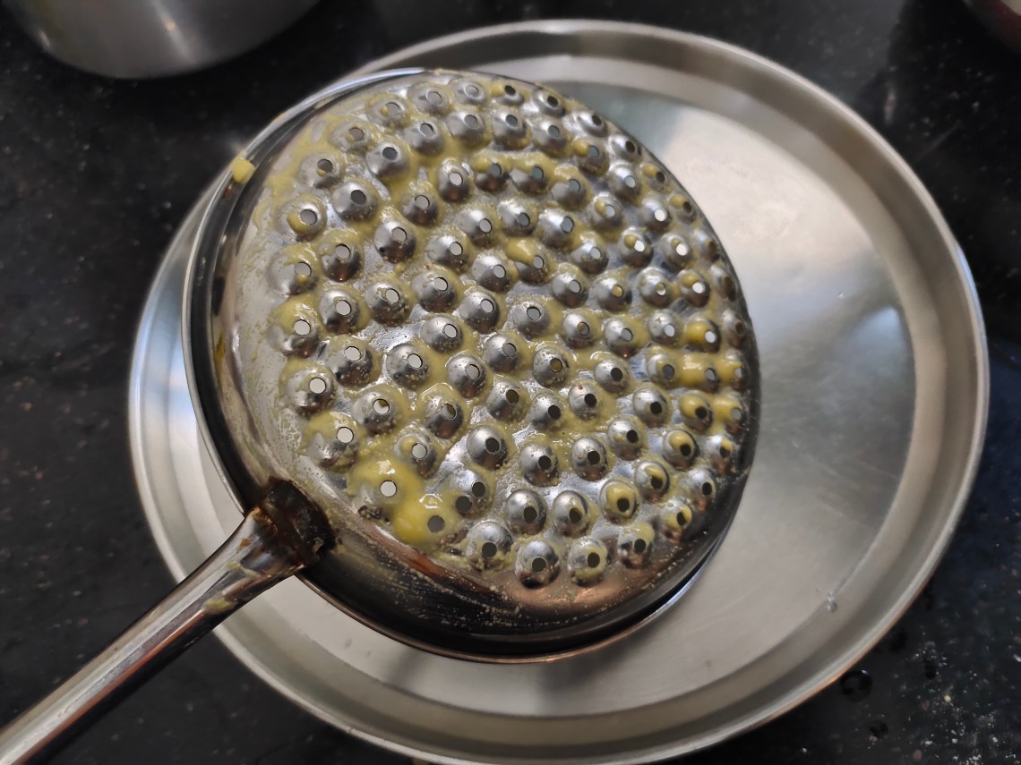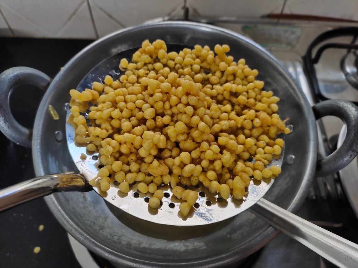 Move around the ladle on the skimmer ladle and tap it for boondis to drop into oil.