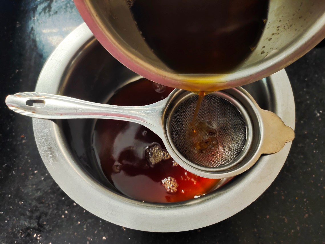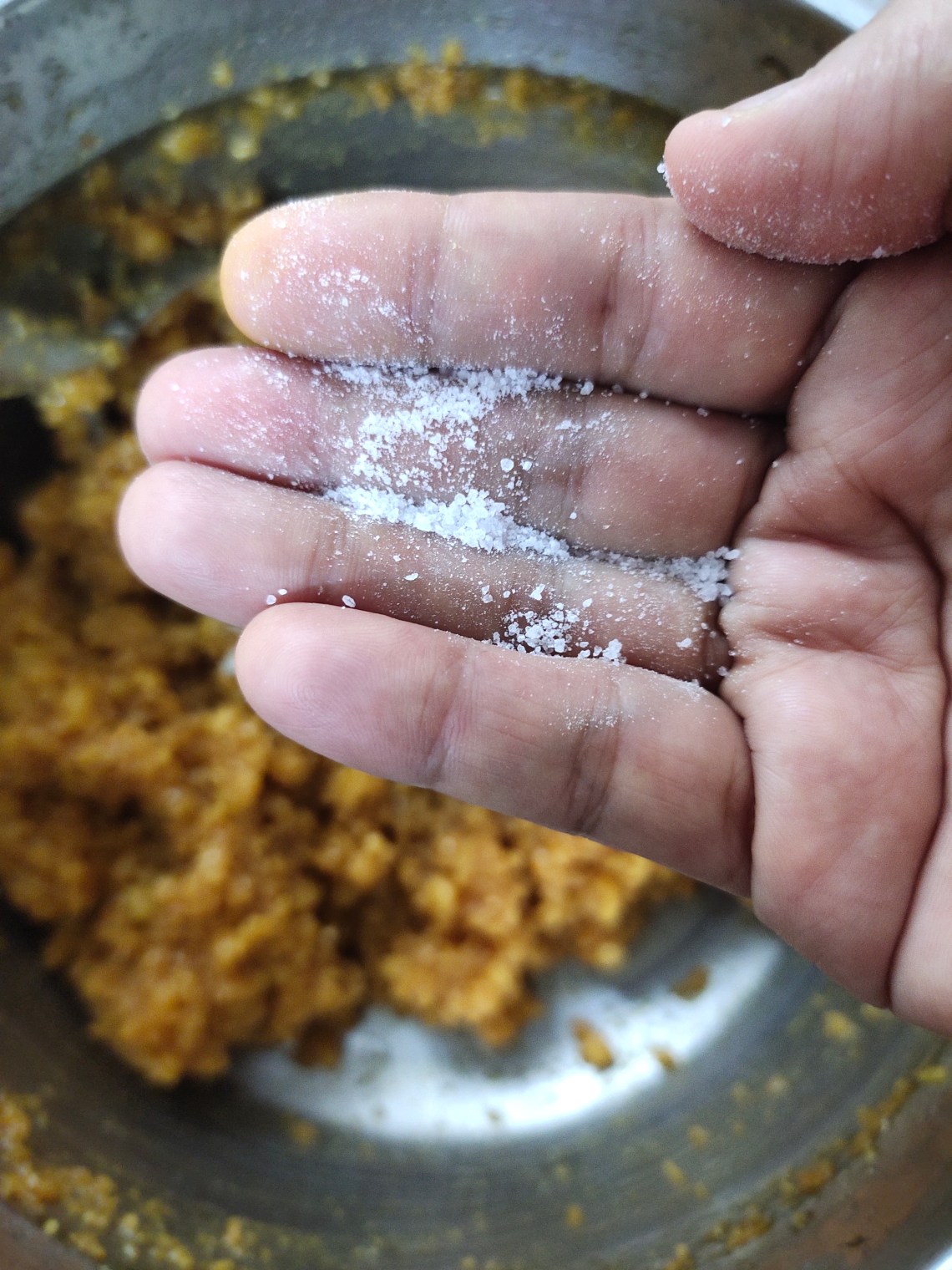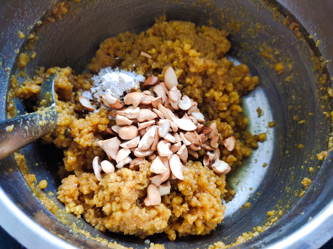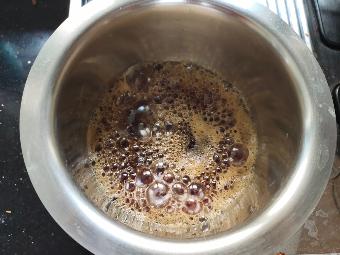Heat the pan and stir it until Jaggery dissolves and stop the flame.
