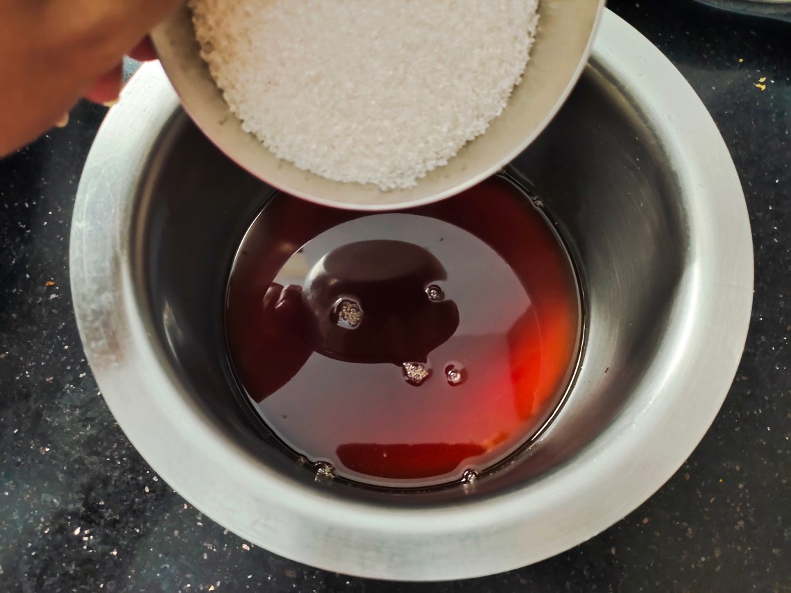 In a pan take 1 cup jaggery and add water till the jaggery is soaked.