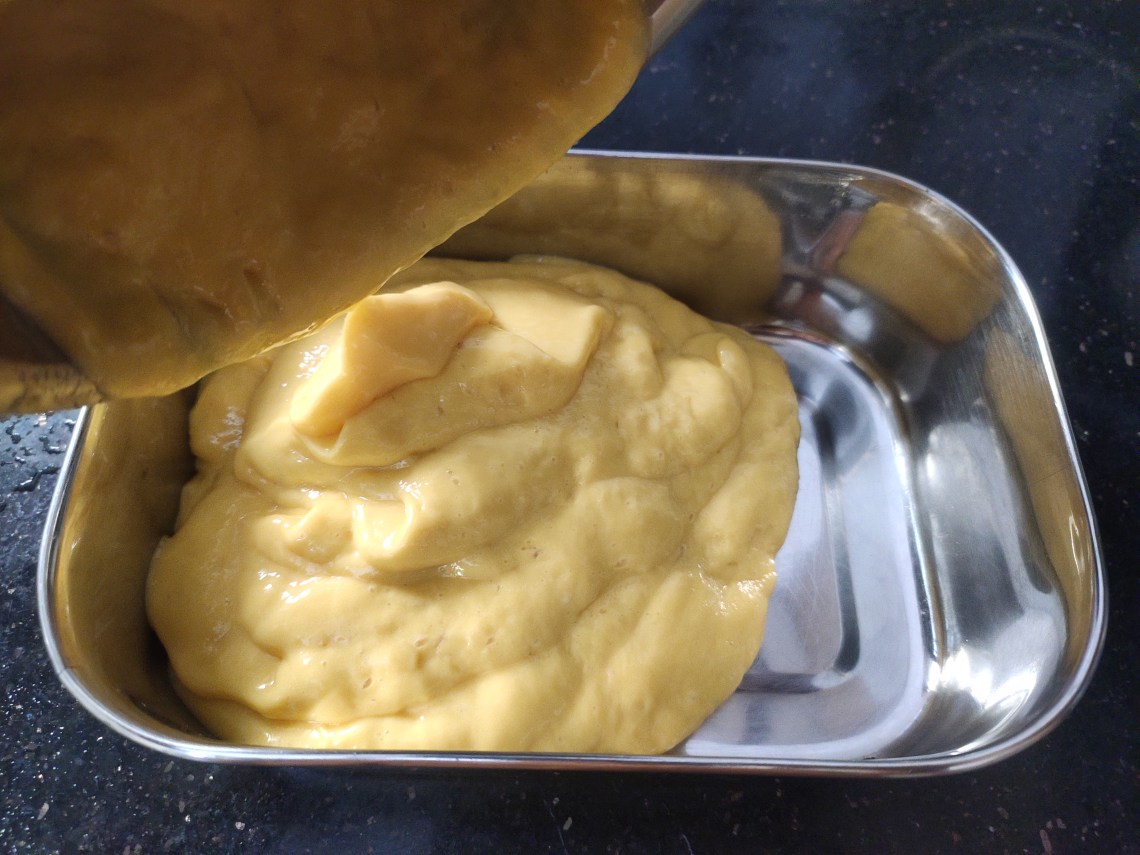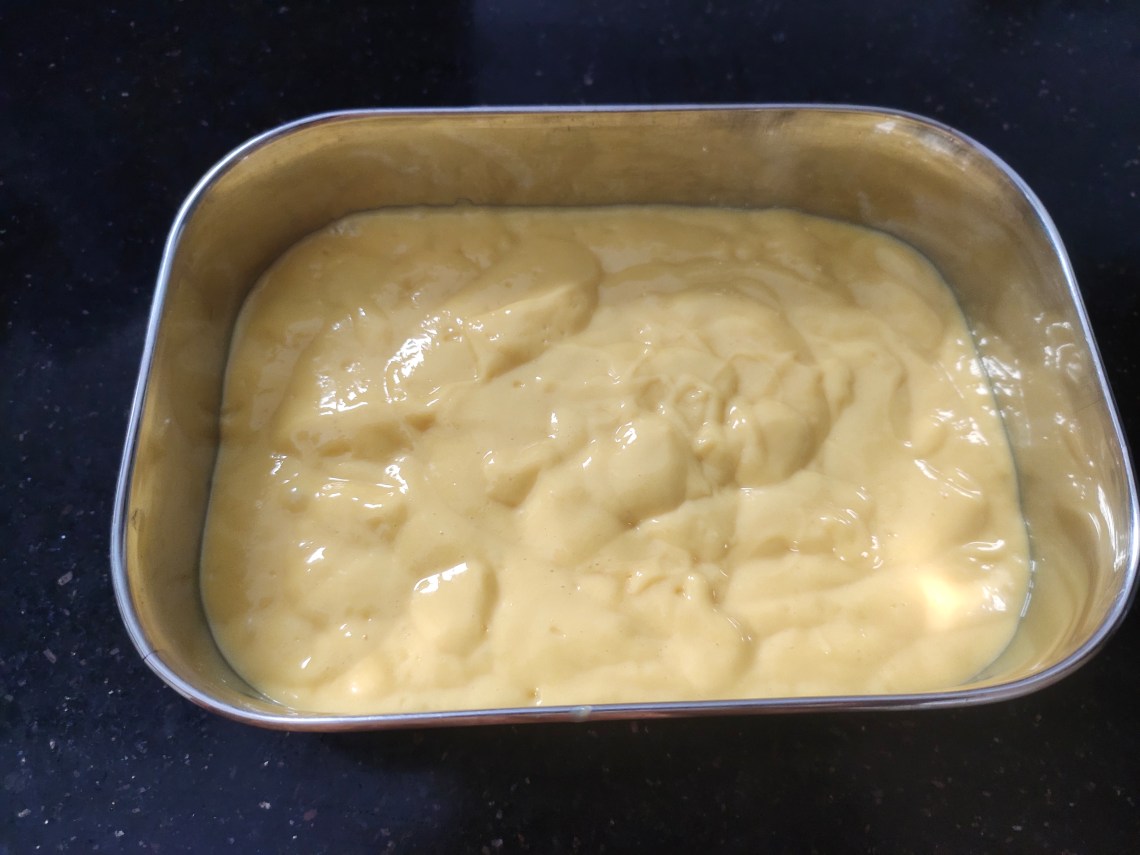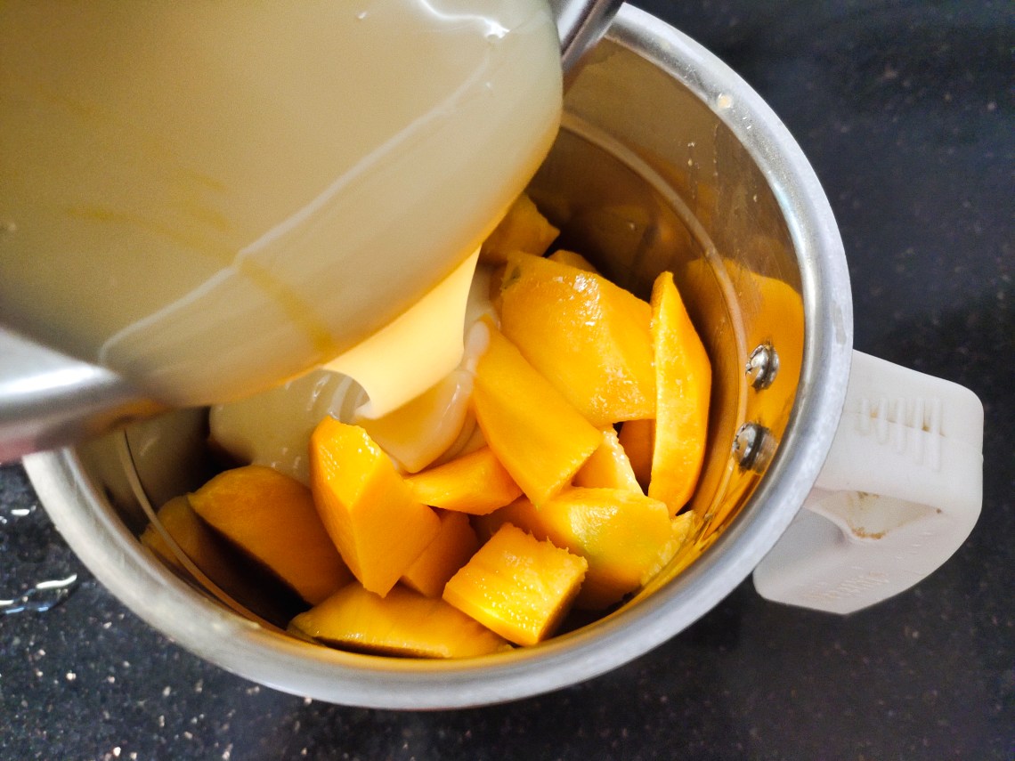 Mixer jar, air tight container, mangoes and hands should be wiped clean without any water droplet to avoid crystals in ice cream.