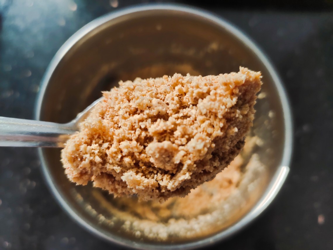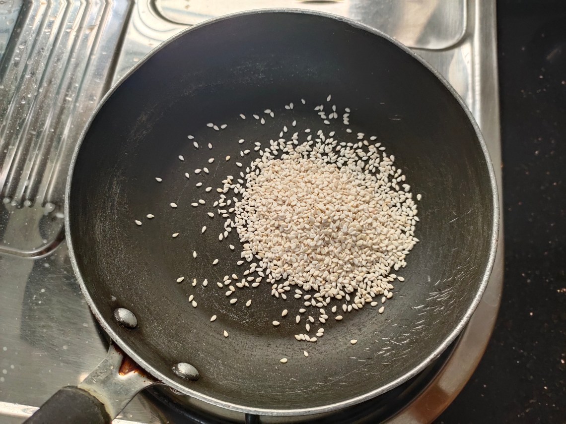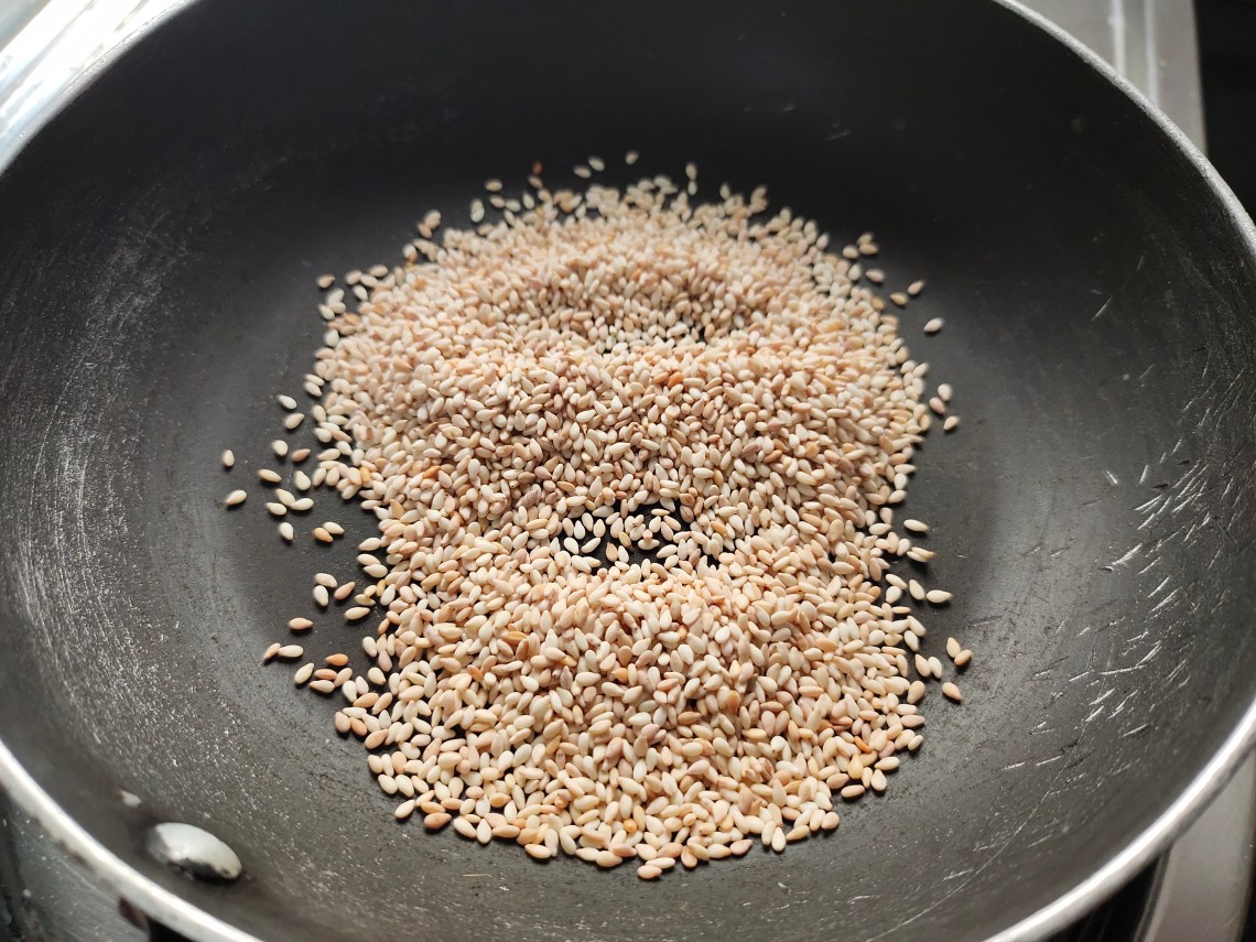 In a small mixer jar powder the roasted sesame seeds using little olive oil.