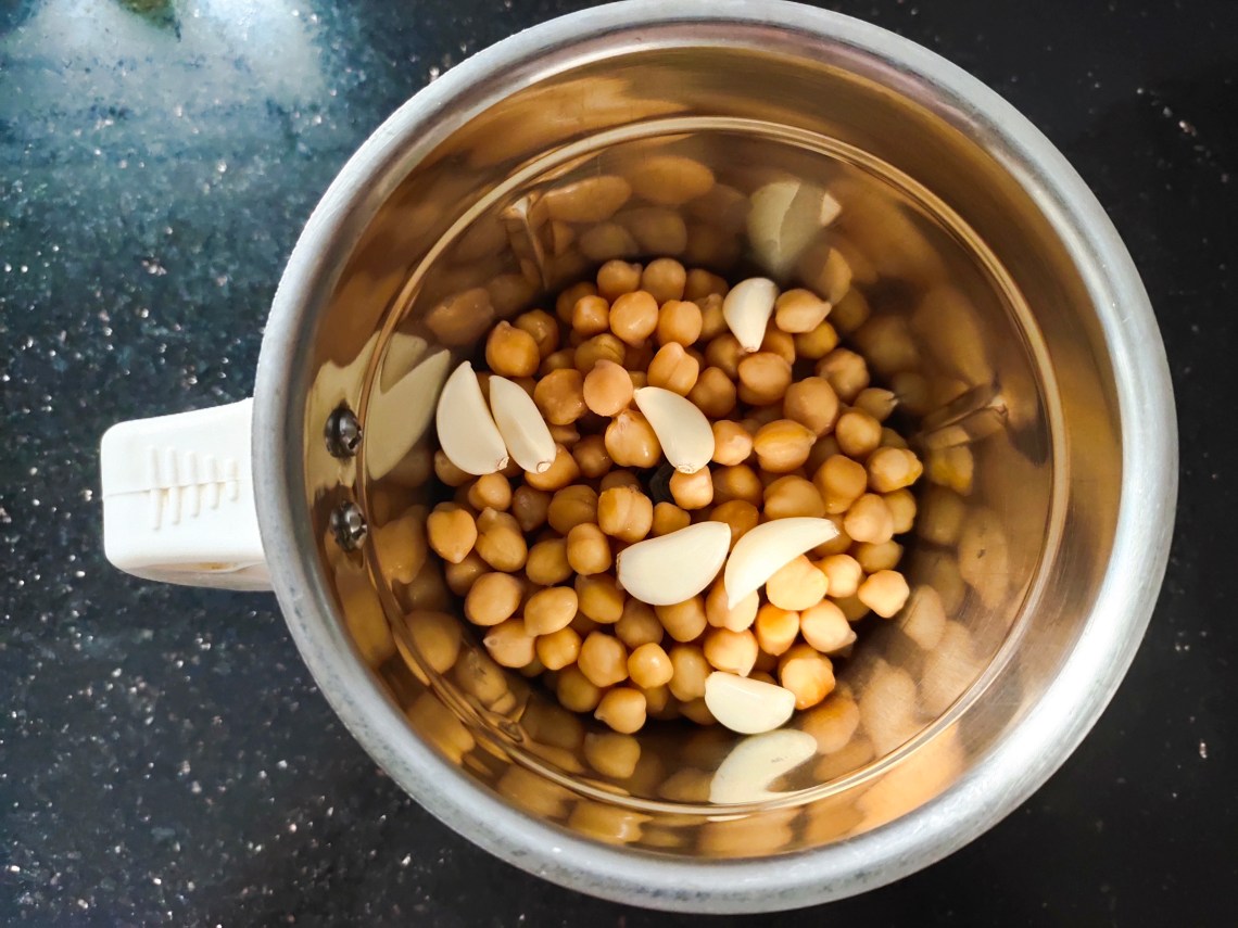 Now in a medium size mixer jar add in the cooked chickpeas and garlic.