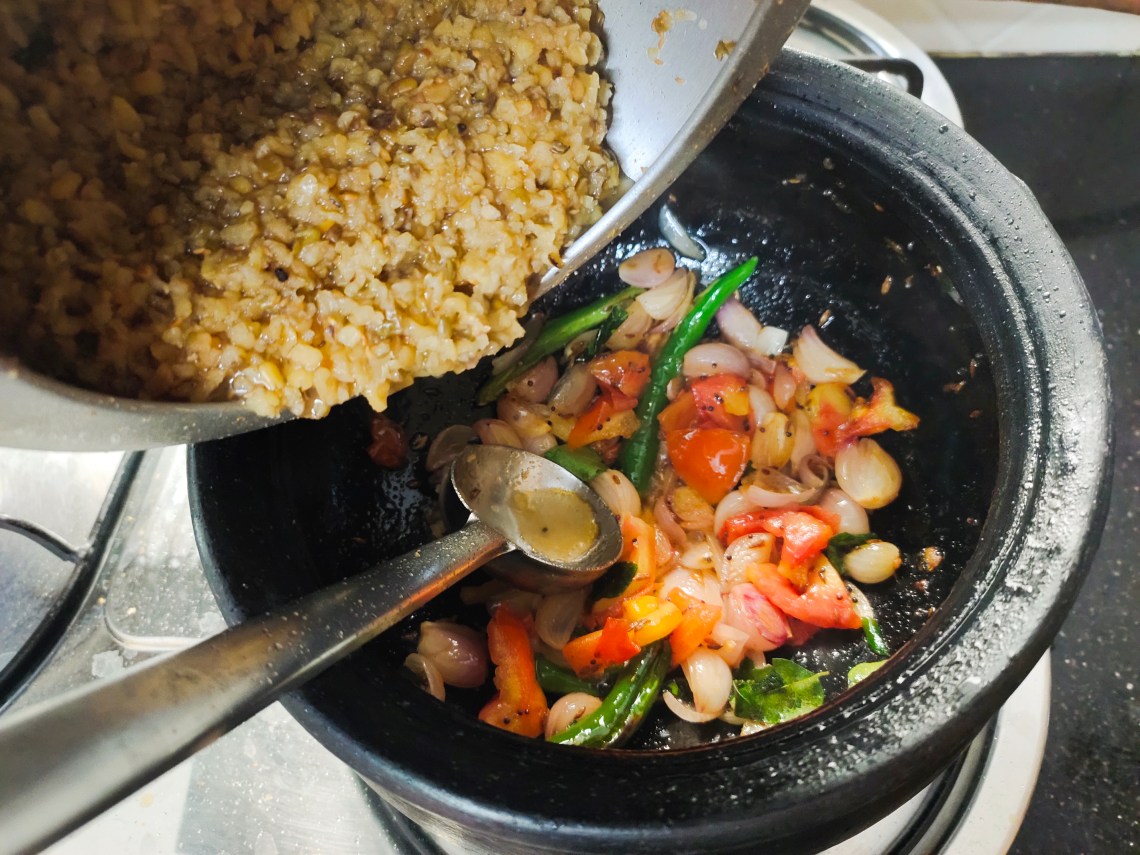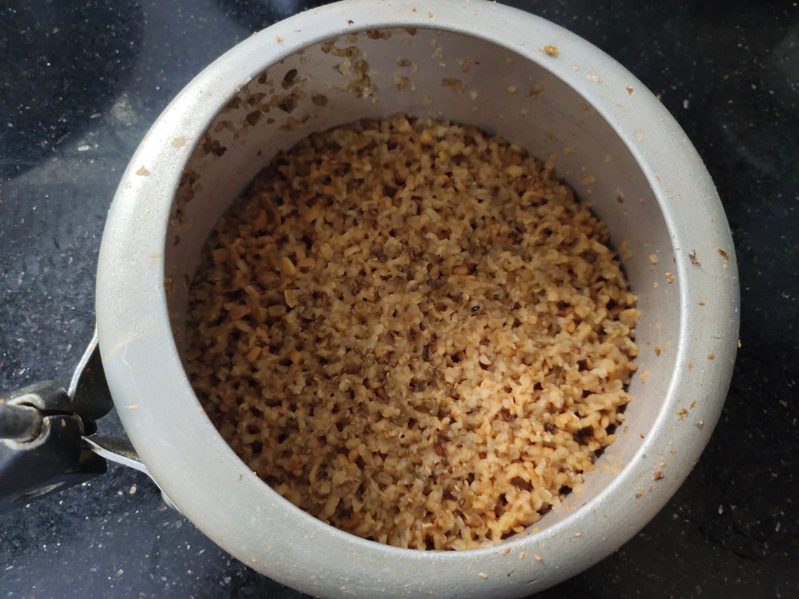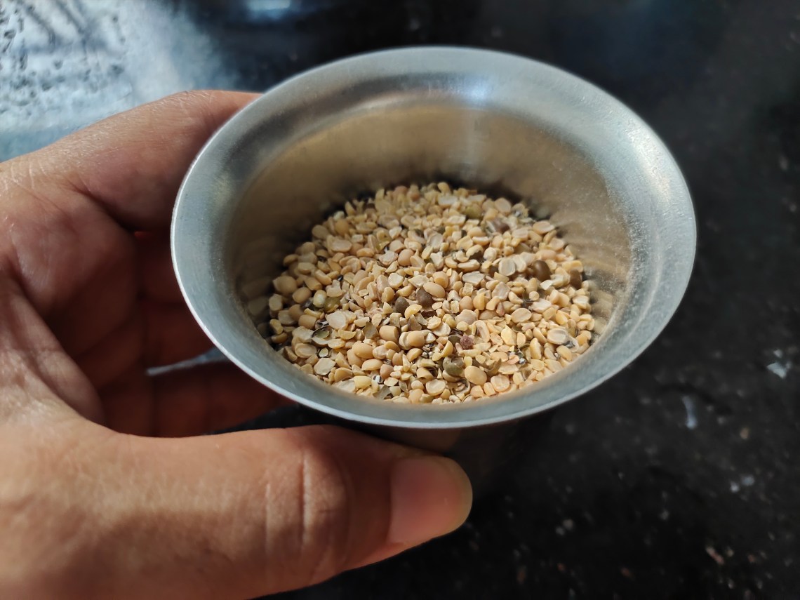 Whole green gram dhal is used in many south Indian and north Indian dishes for breakfast, lunch and dinner. Moong dal is high in protein and is used in numerous dishes. In our house, the traditional method of processing is followed. Traditional methods are followed by my mom learnt from my granny. I used to help my mom in breaking the dal using the grinding stone. So, I always elucidate my kids how the fun learning has become a part of cooking. Now my kids help me in breaking the green gram dal. Steps of breaking the dal using a grinding stone and separating the chaff are very important in preparing this dal. Organic green dal is used which is unpolished, smaller in size than the regular one and it tastes better. You can buy whole green gram dal, roast it and break it using a mixer jar as well.