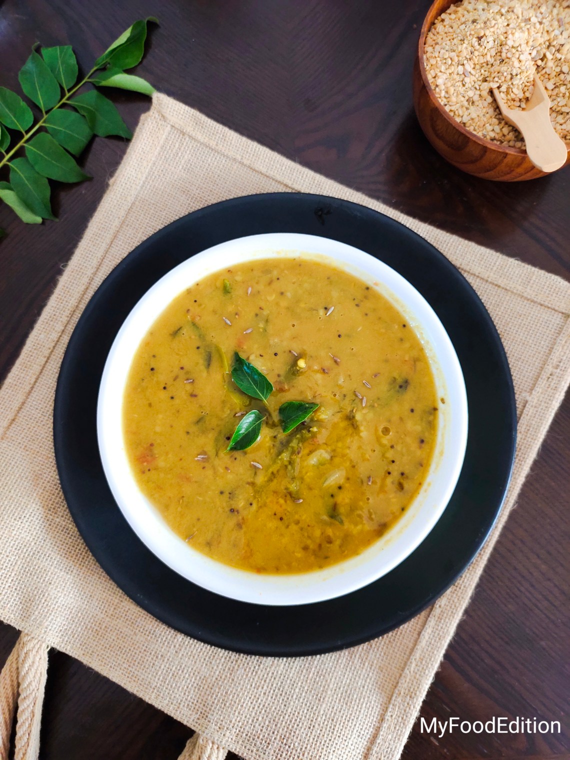 In a pressure cooker add the moong dal, 2 glasses of water, turmeric powder and give it 3 to 4 whistles.