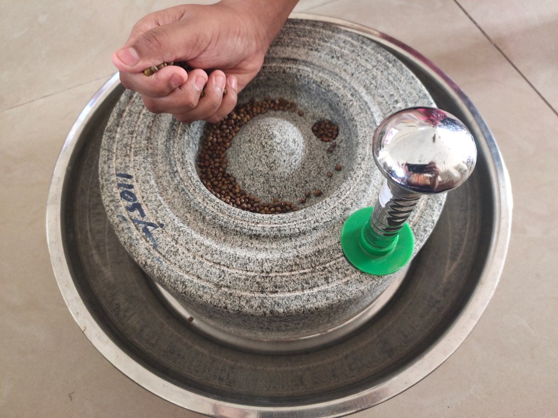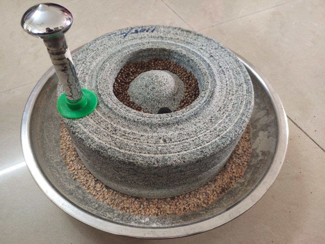 Roasted dal is added little by little into the hole on the top of the grinding stone.