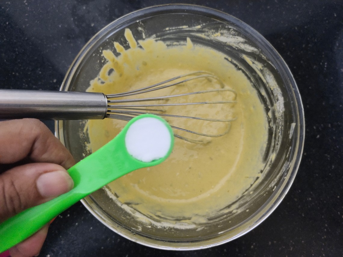 Mix well without lumps and then add baking soda/ fruit salt and stir again.