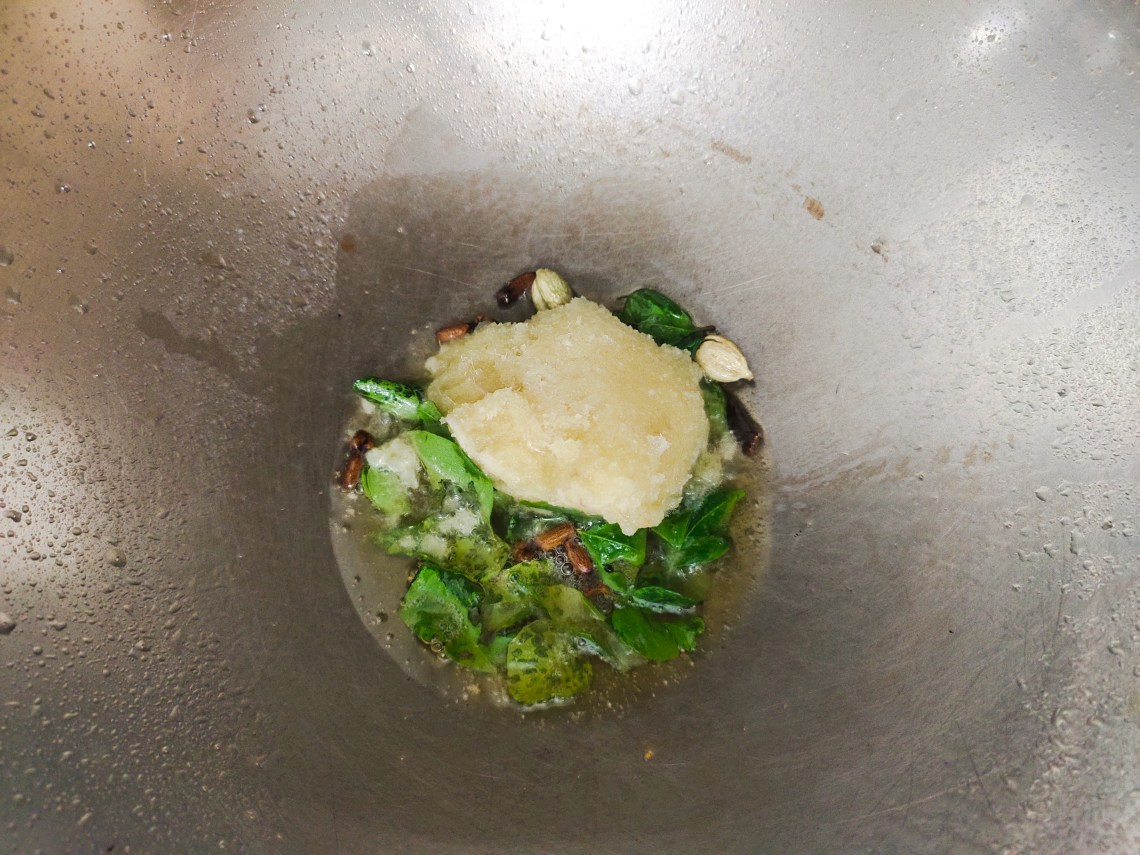 Heat oil in a pan and temper cardamom, cinnamon,cloves, curry leaves and then add ginger garlic paste.
