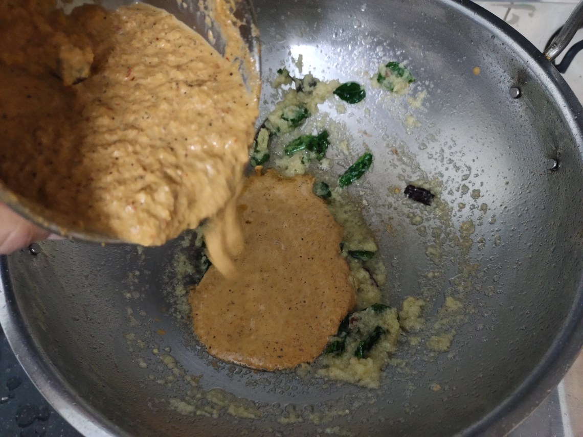 Saute ginger garlic paste until raw smell goes then add the ground paste.