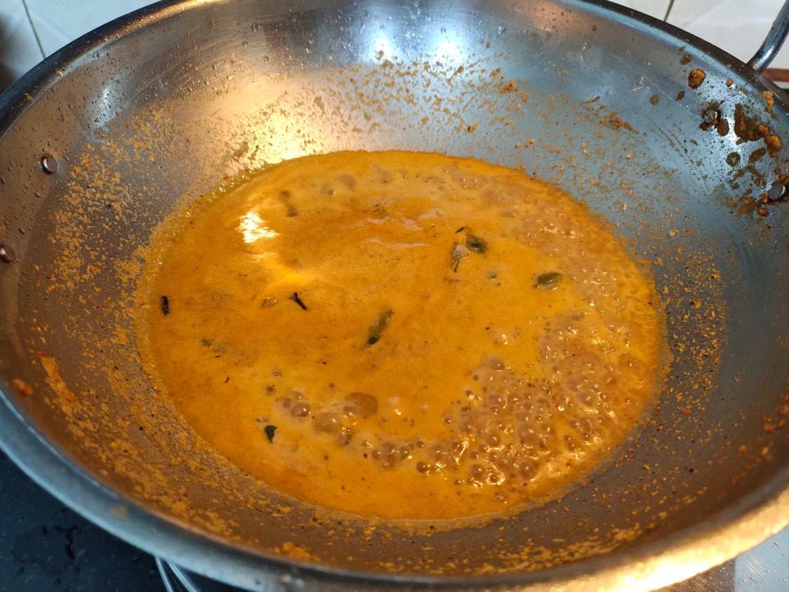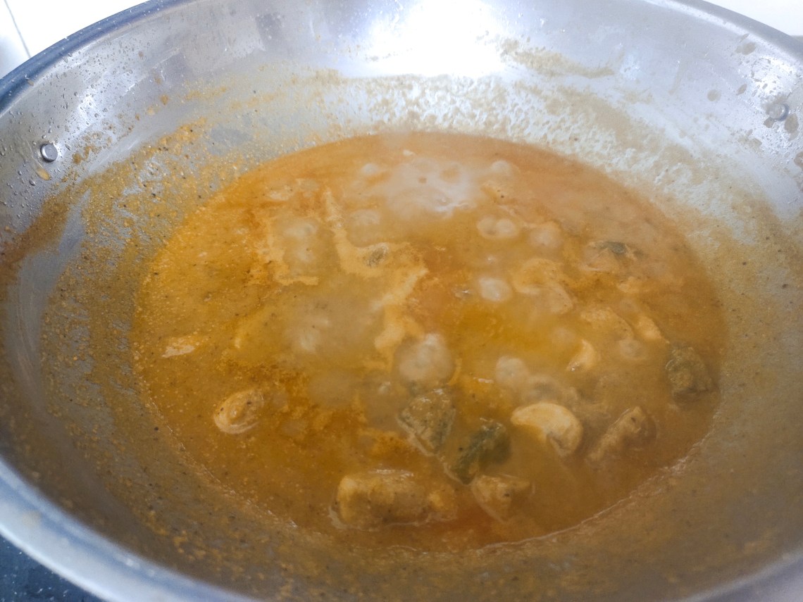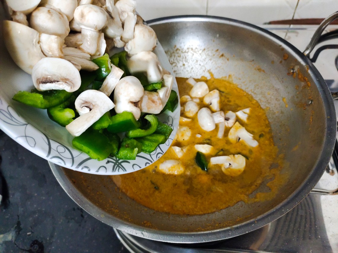 When the mushrooms are cooked, add the roasted bengal gram dal powder (for thickening).