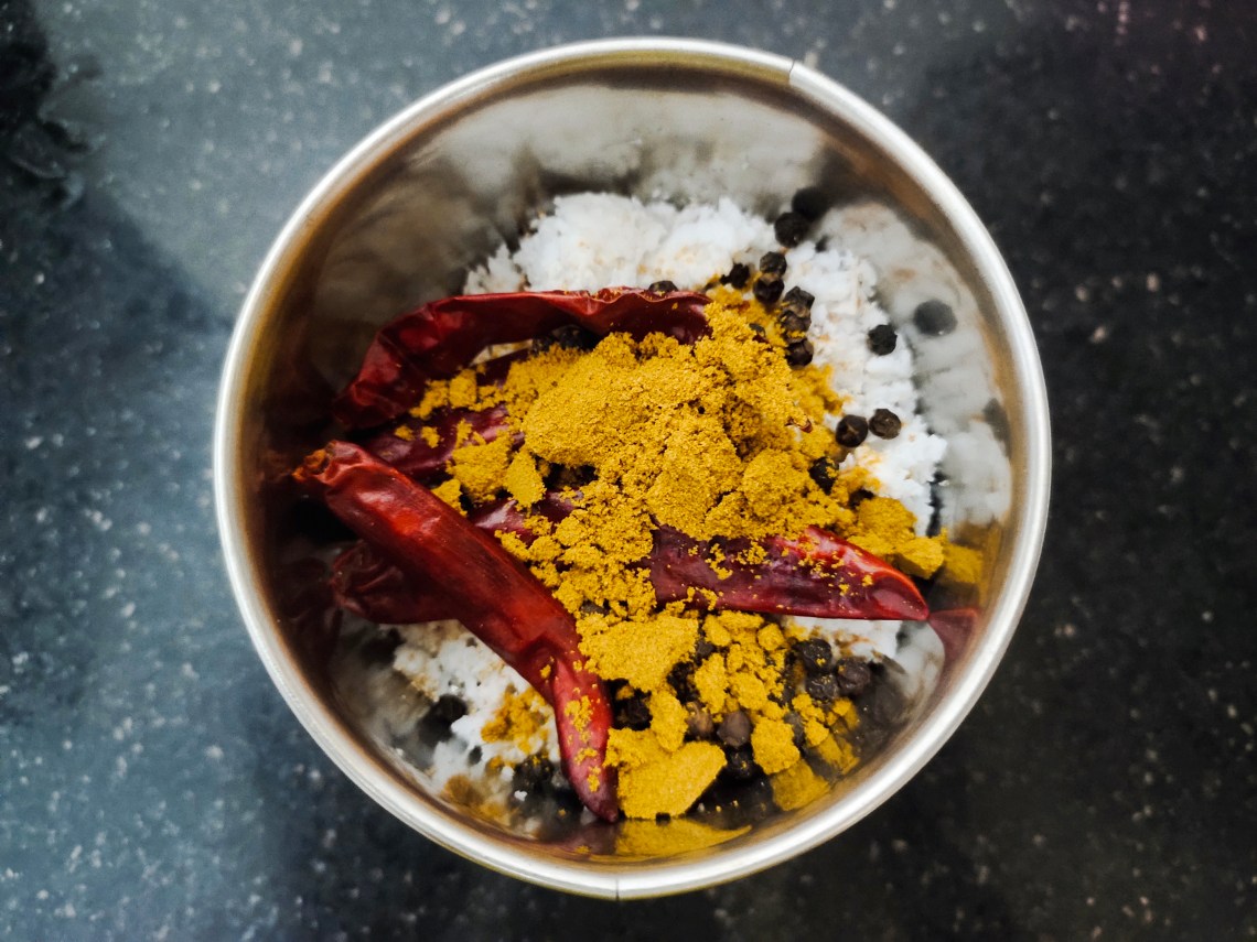 In a mixer jar add the coconut, red chillies, poppy seeds, coriander powder, pepper corns and grind it to a fine paste using little water.