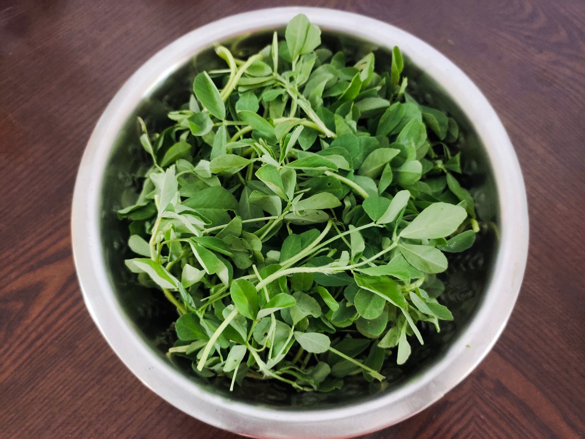 Clean and chop the methi leaves with stems finely.