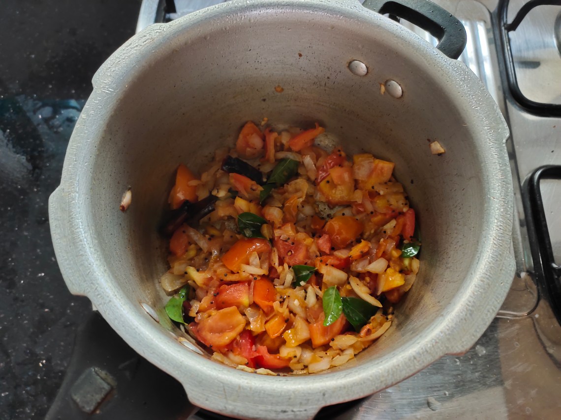 Heat oil in a pressure cooker and temper mustard, curry leaves and red chillies.