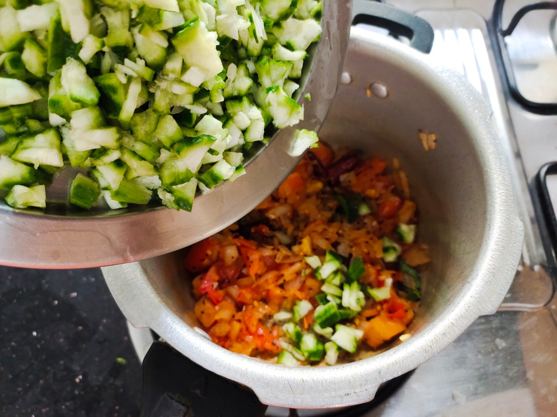 When the tomatoes are mushy add in the finely chopped ridge gourd.