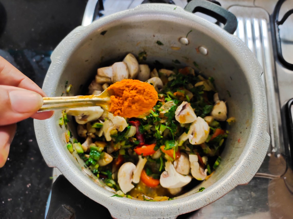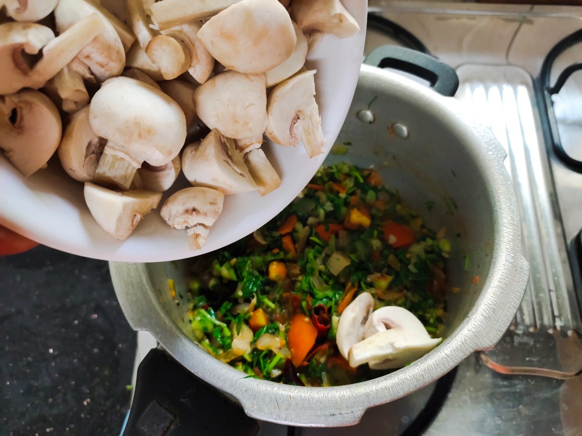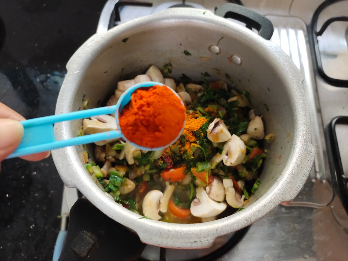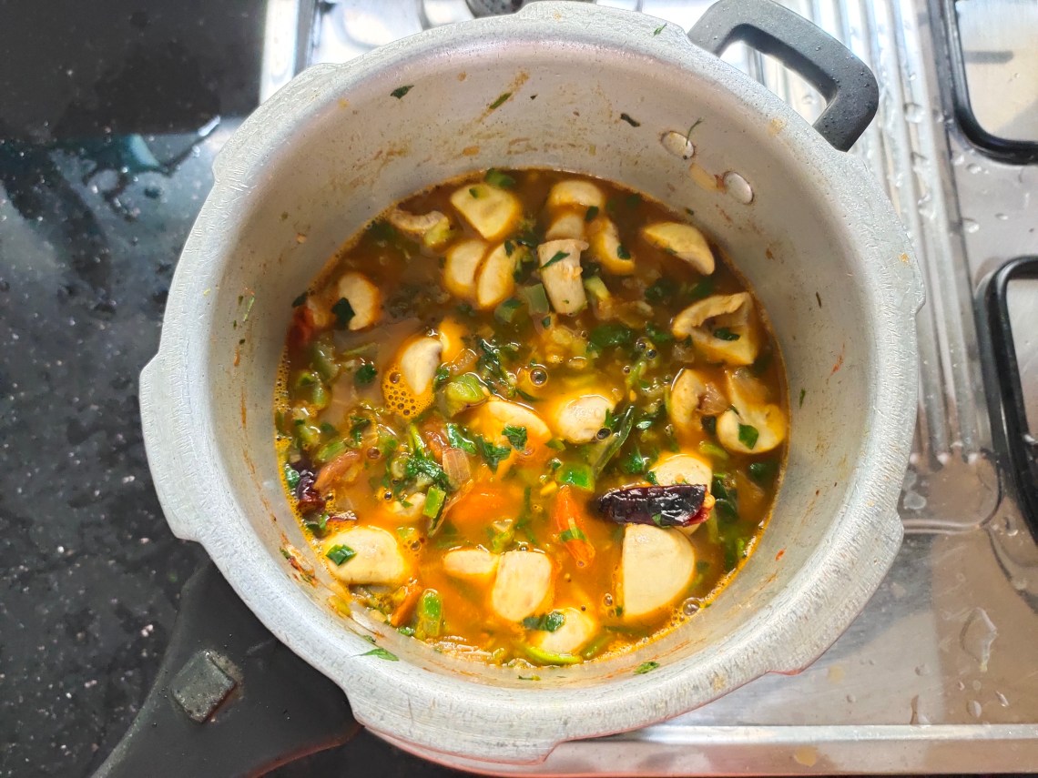 You may add 1/2 kg meat to this curry instead of mushrooms and give whistles accordingly.